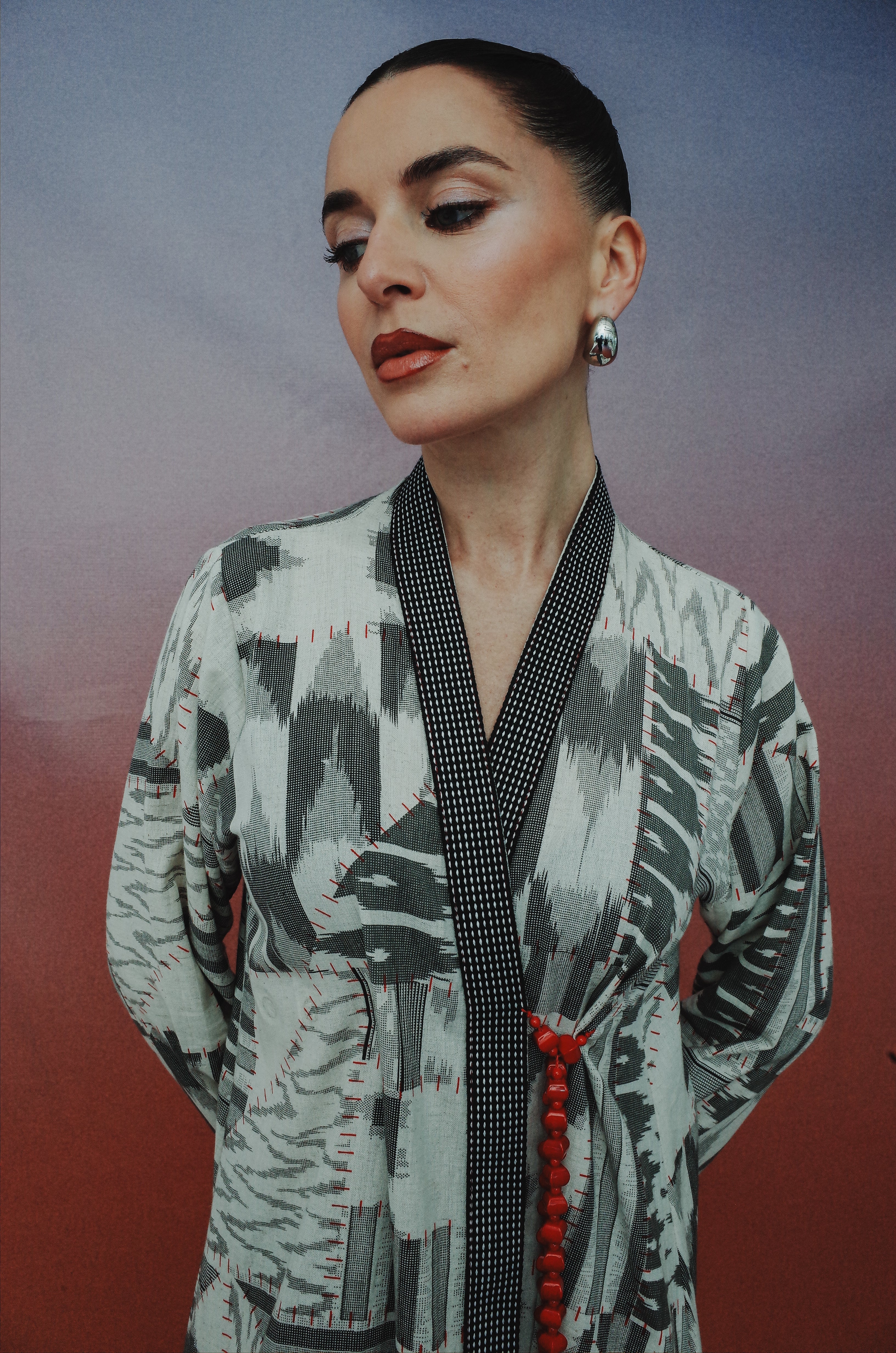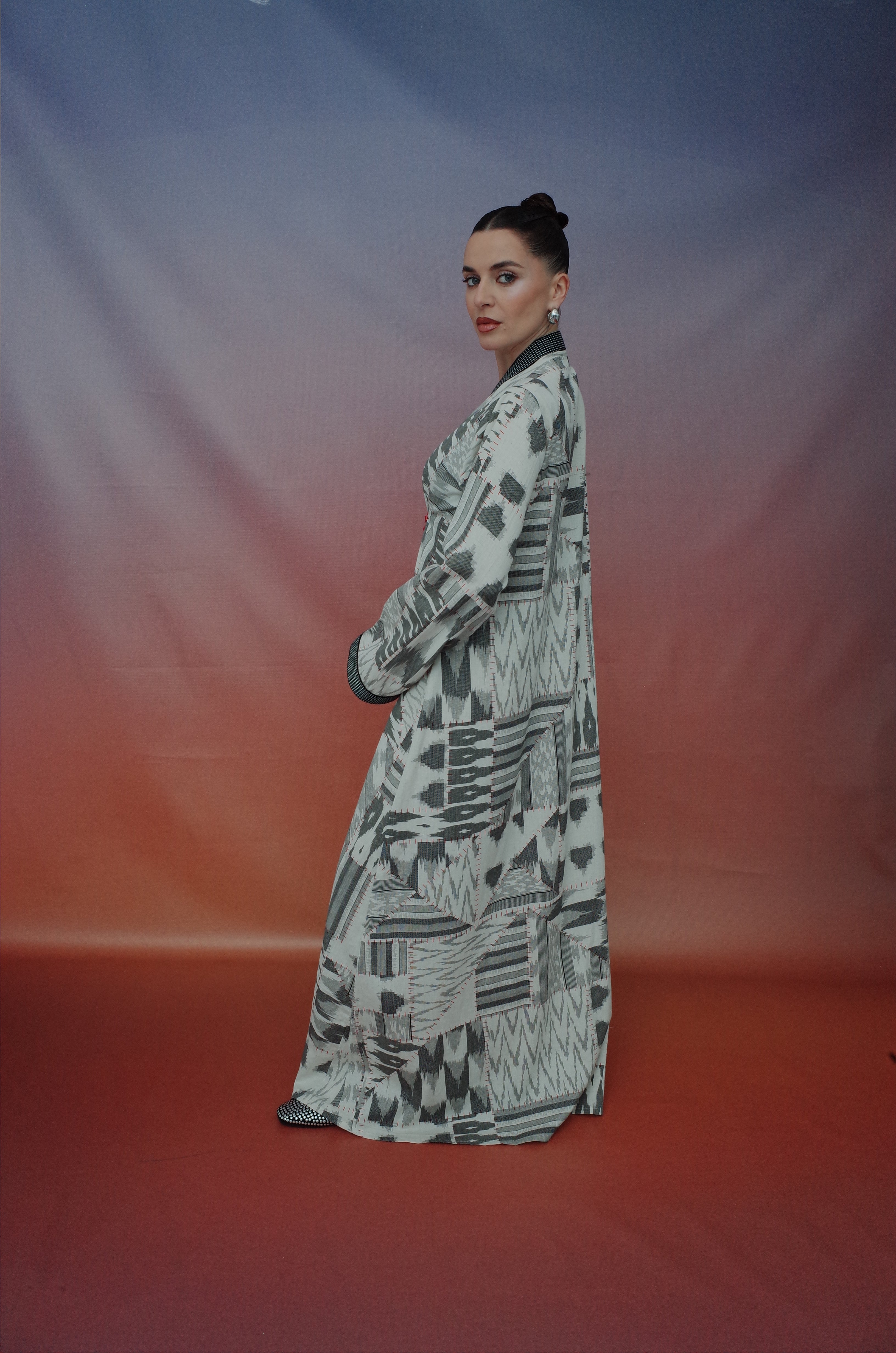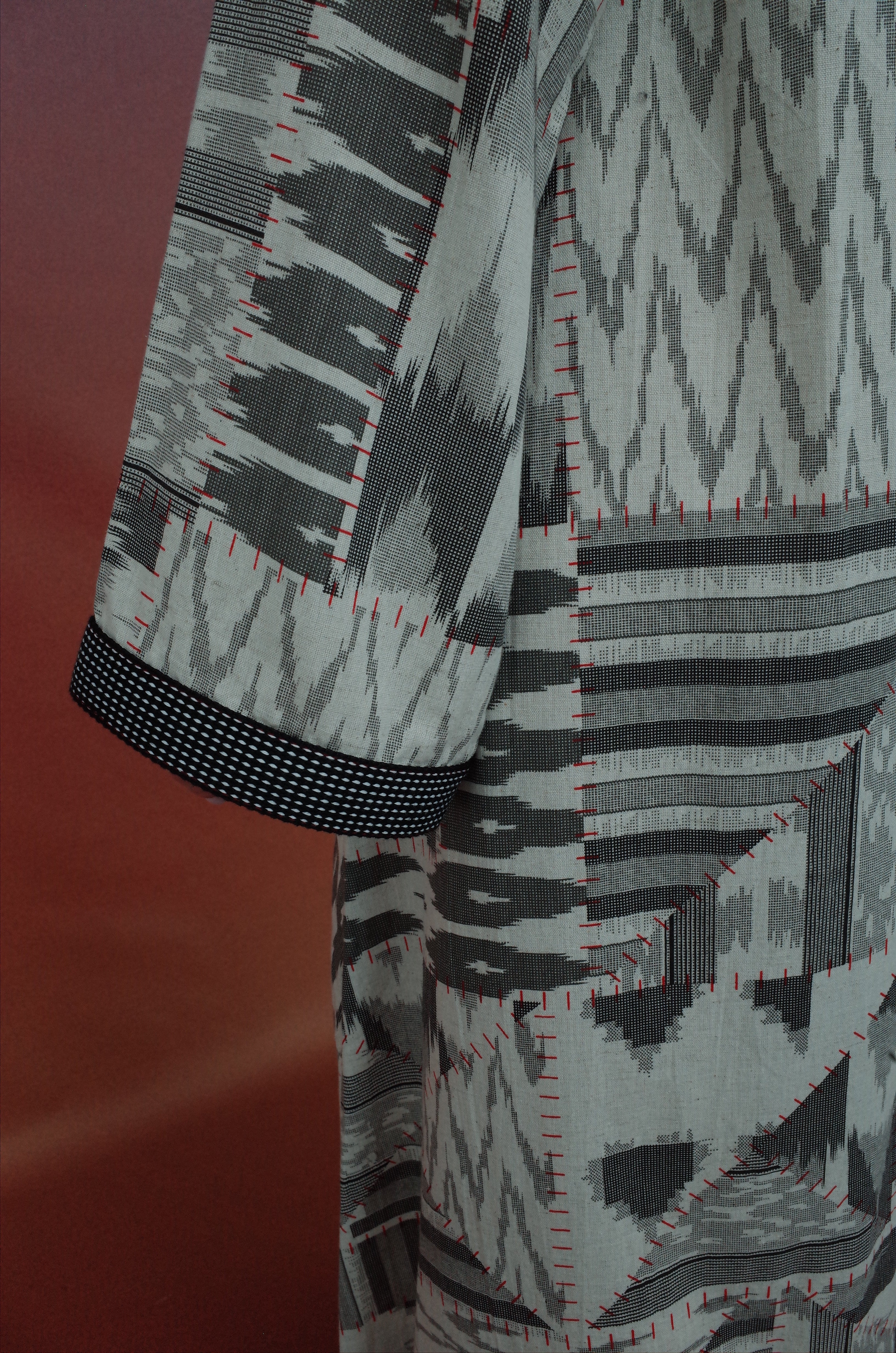 A symphony of black and red unfolds in flowing cotton, bold yet effortless. A rich lining frames the piece, its depth accentuated by intricate red beads, each one a quiet echo of tradition. Draped with precision, it moves like poetry—graceful, timeless, and commanding.