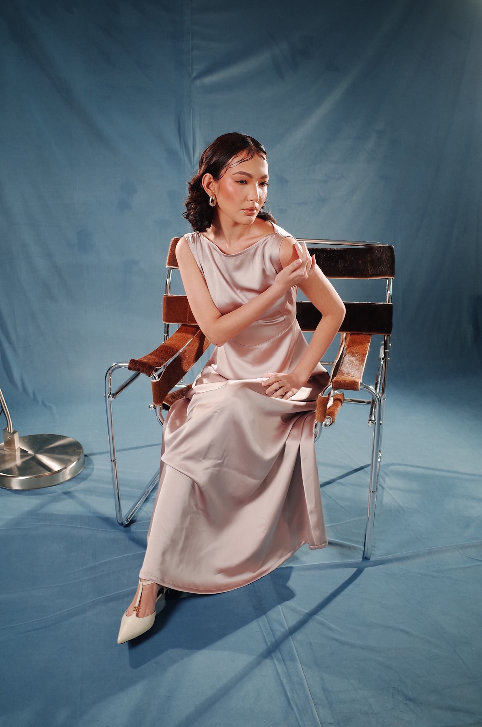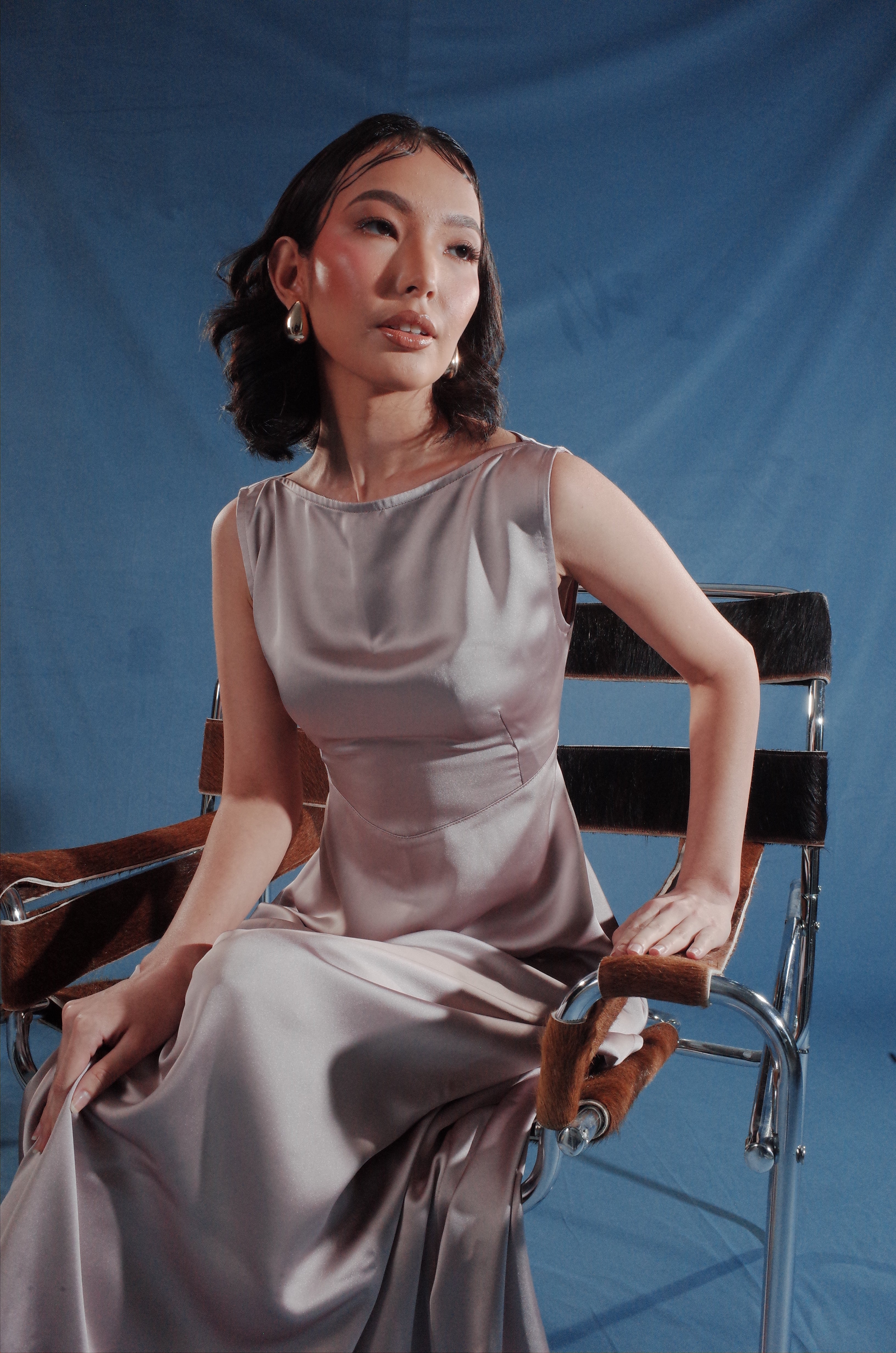 Solene moves like sunlight on still water—quiet, fluid, and full of grace. Crafted from pure silk, its soft sheen catches the light with every step, creating a gentle glow that lingers. The sculpted bodice and curved seam lines shape the silhouette with ease, while the high neckline adds a note of quiet strength.