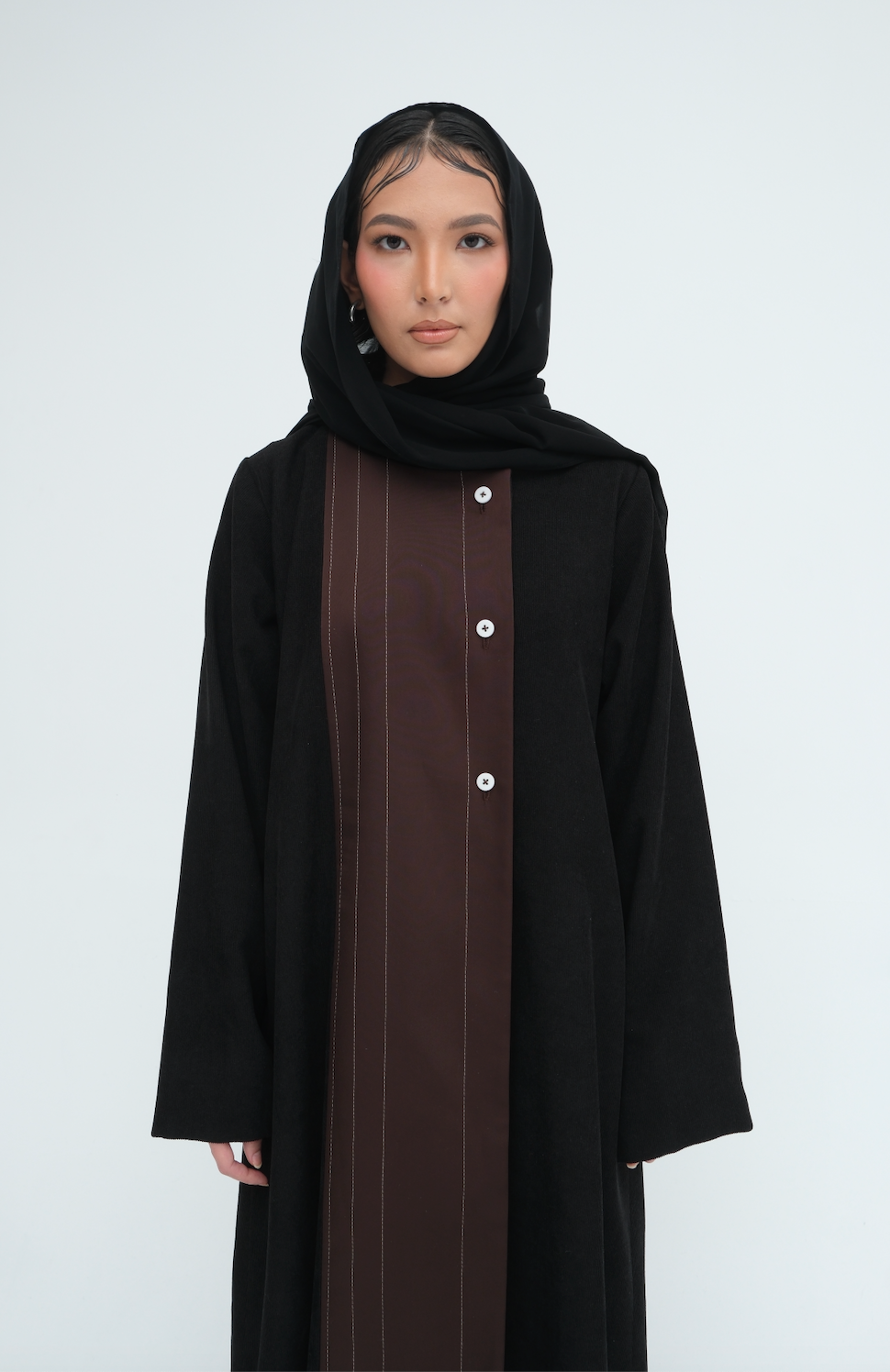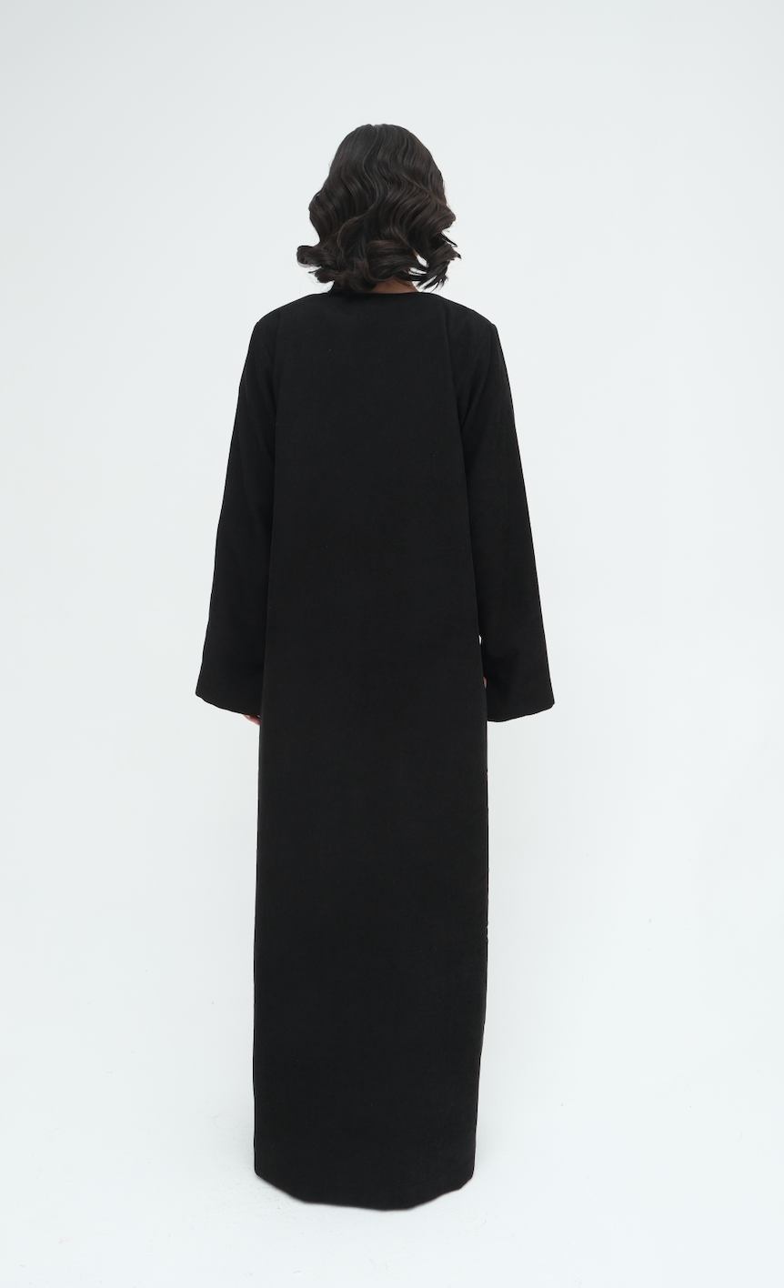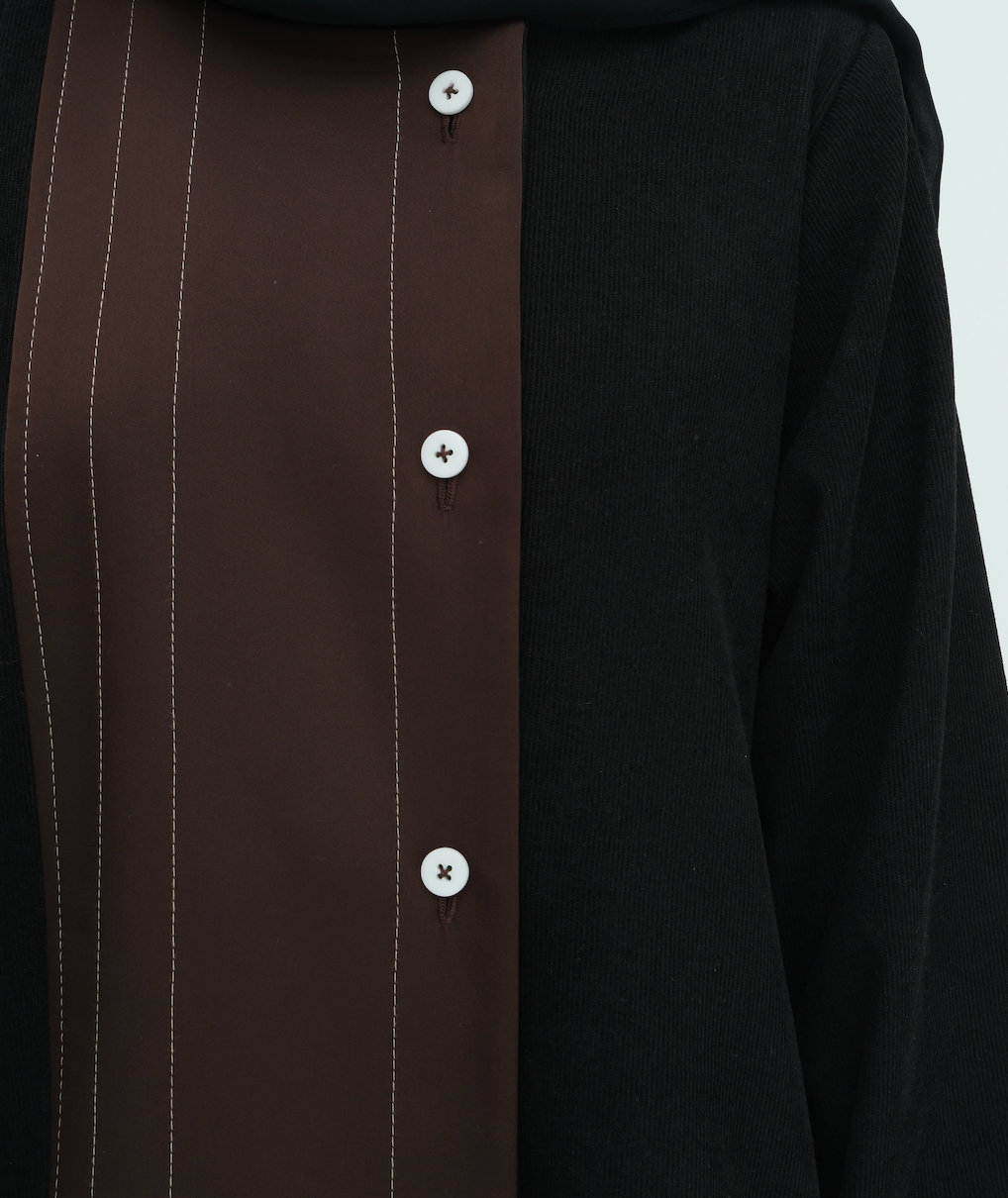 Textured contrast meets quiet structure in Nari, a distinctive piece crafted with a blend of soft corduroy and a smooth silk panel along the front. The interplay between the rich fabrics creates depth and dimension, while the vertical stitched lines elongate the form for a clean, refined finish.