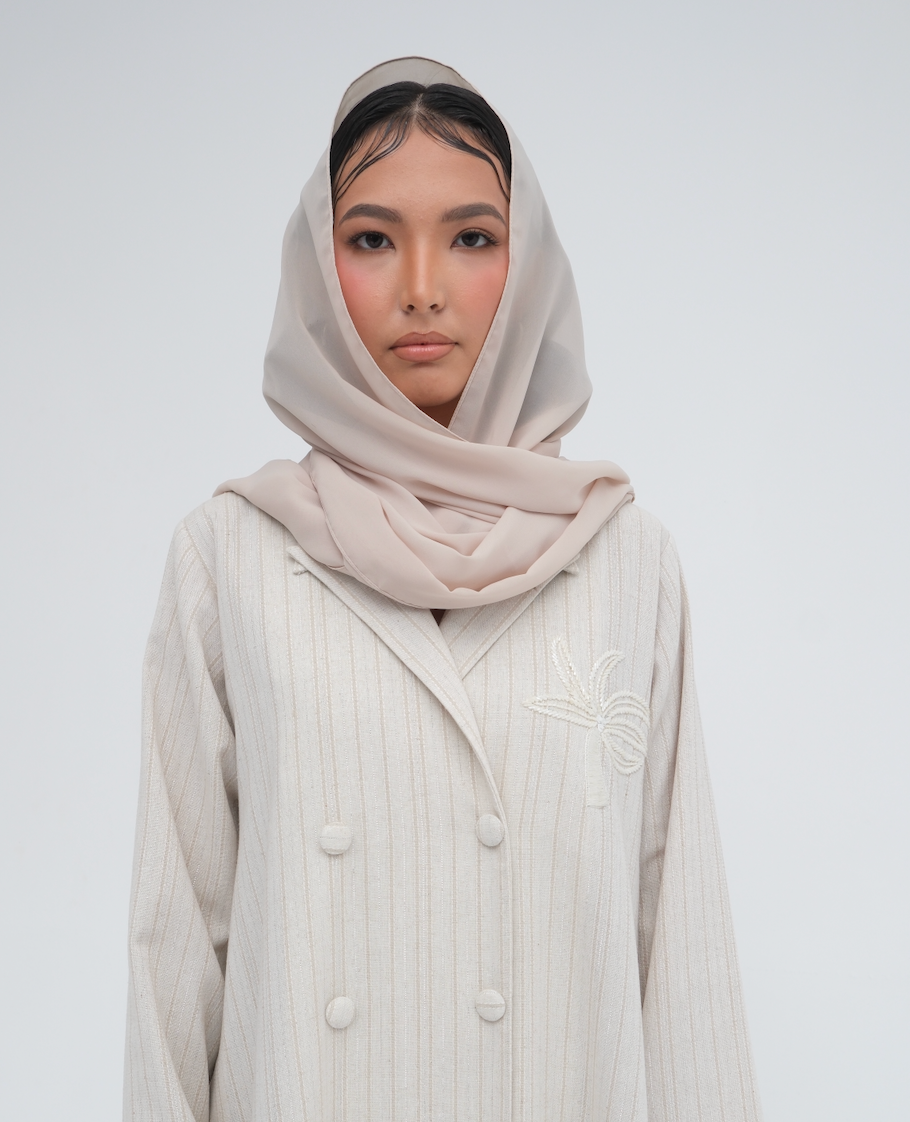 A signature metric palm tree embroidery accents the chest, offering a quiet nod to identity and craftsmanship. With its double-breasted detailing and sleek silhouette, Mia is a fresh interpretation of timeless layering—made to move with confidence through every setting.