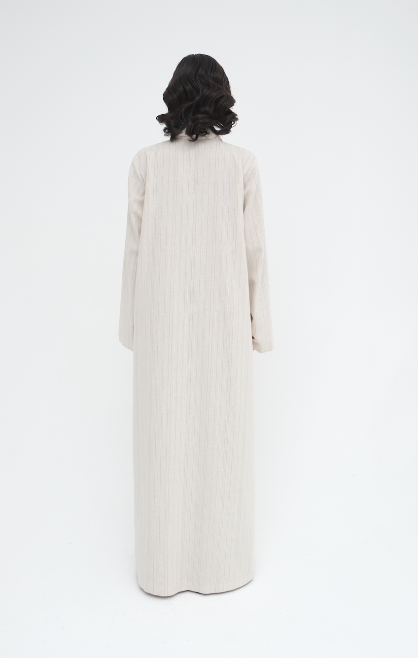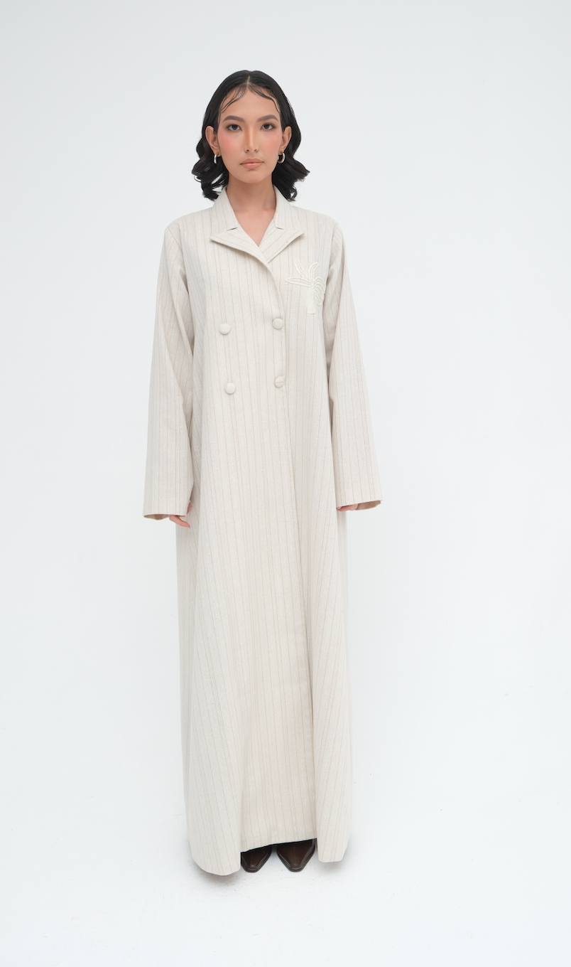 Mia is crafted from striped beige linen and designed in a refined blazer-inspired cut. The clean front enclosure and wide lapels give the piece a tailored edge, while the soft linen texture maintains breathability and ease of wear.