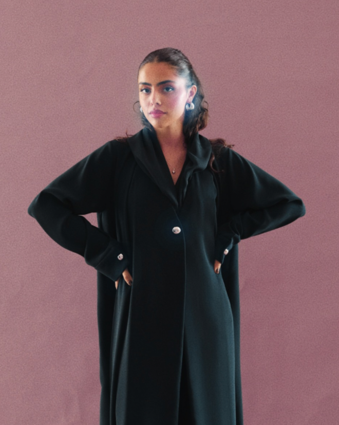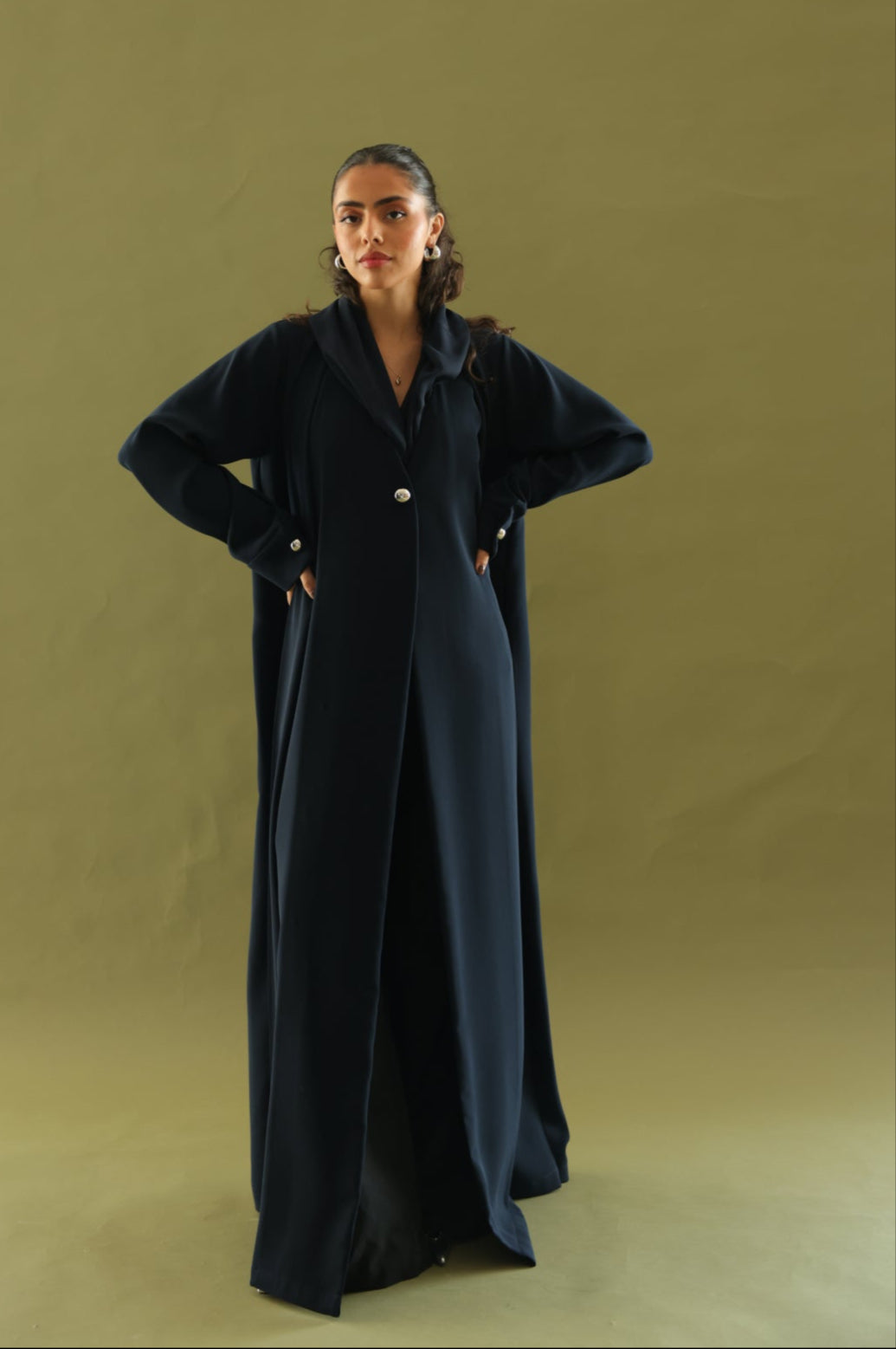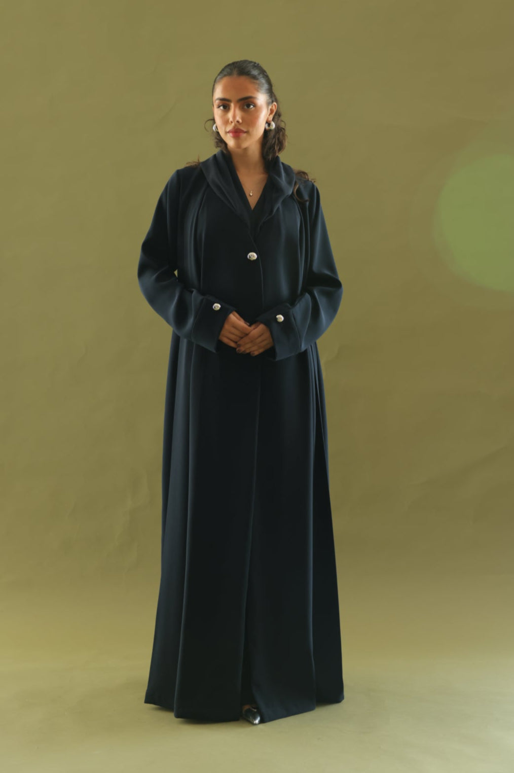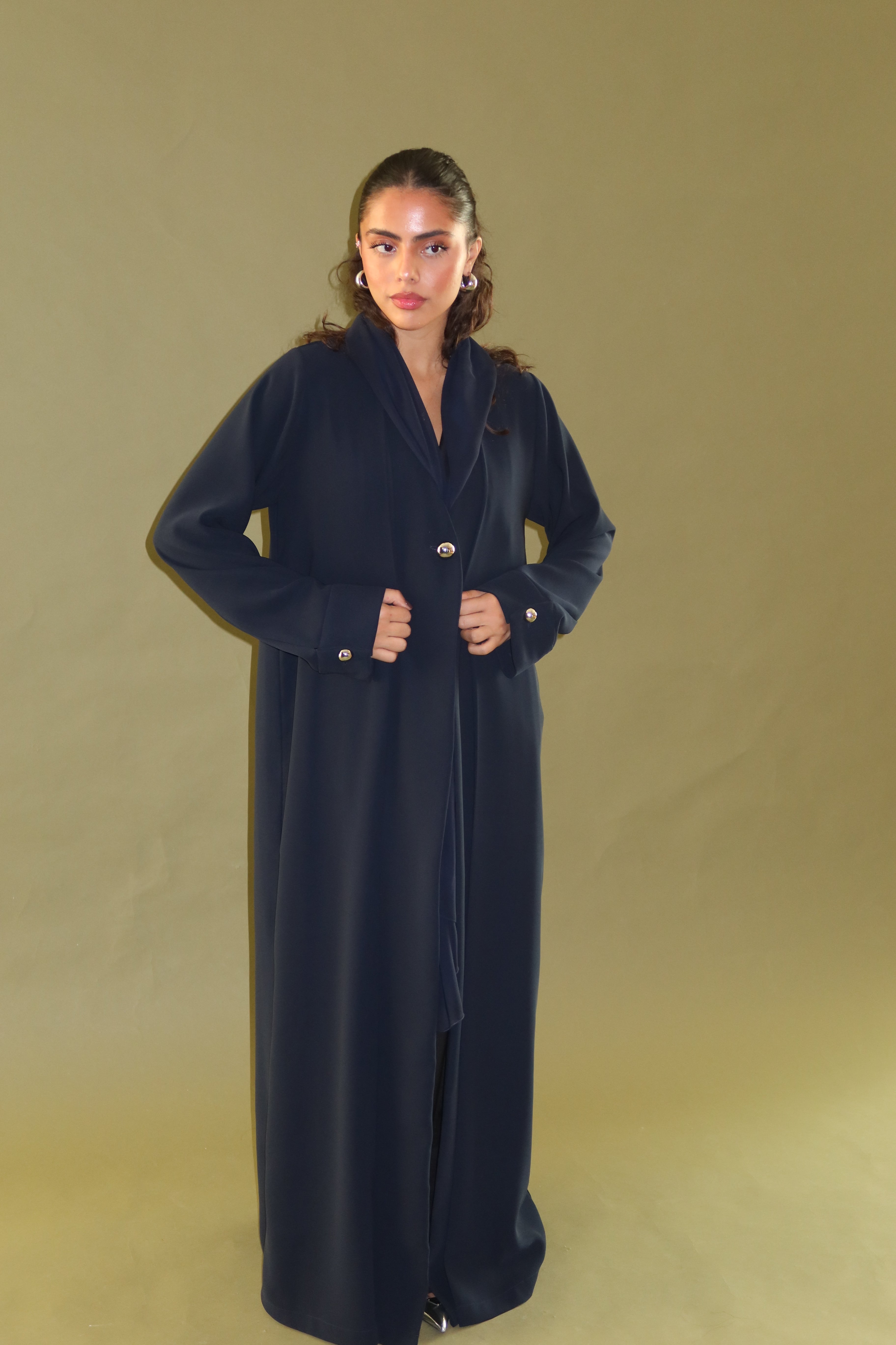 Rich navy colored fabric, shaped beautifully into a abaya that drapes carelessly on the body. It’s front double layer gives a formal yet elegant look perfect for a workday or everyday wear.