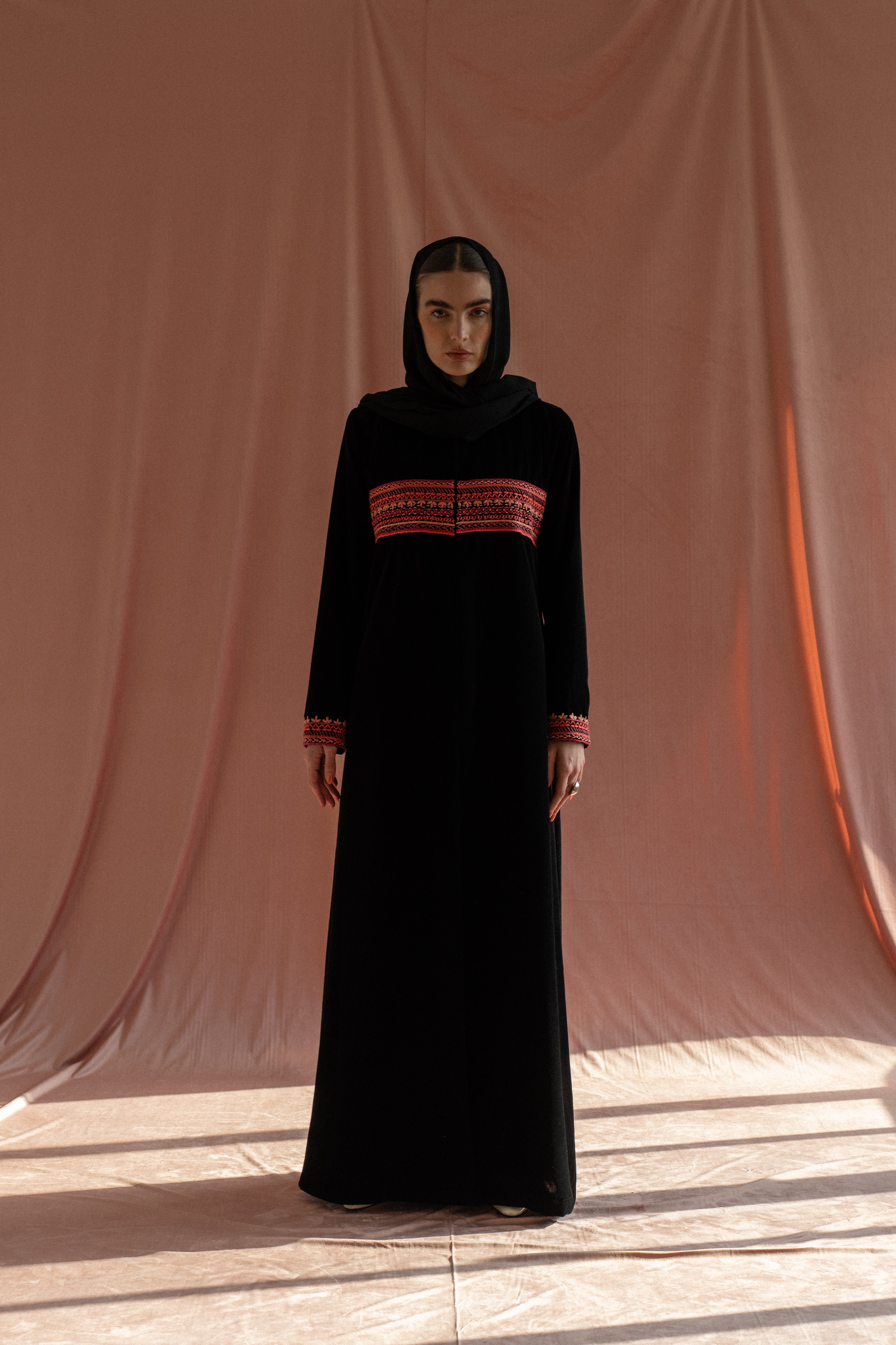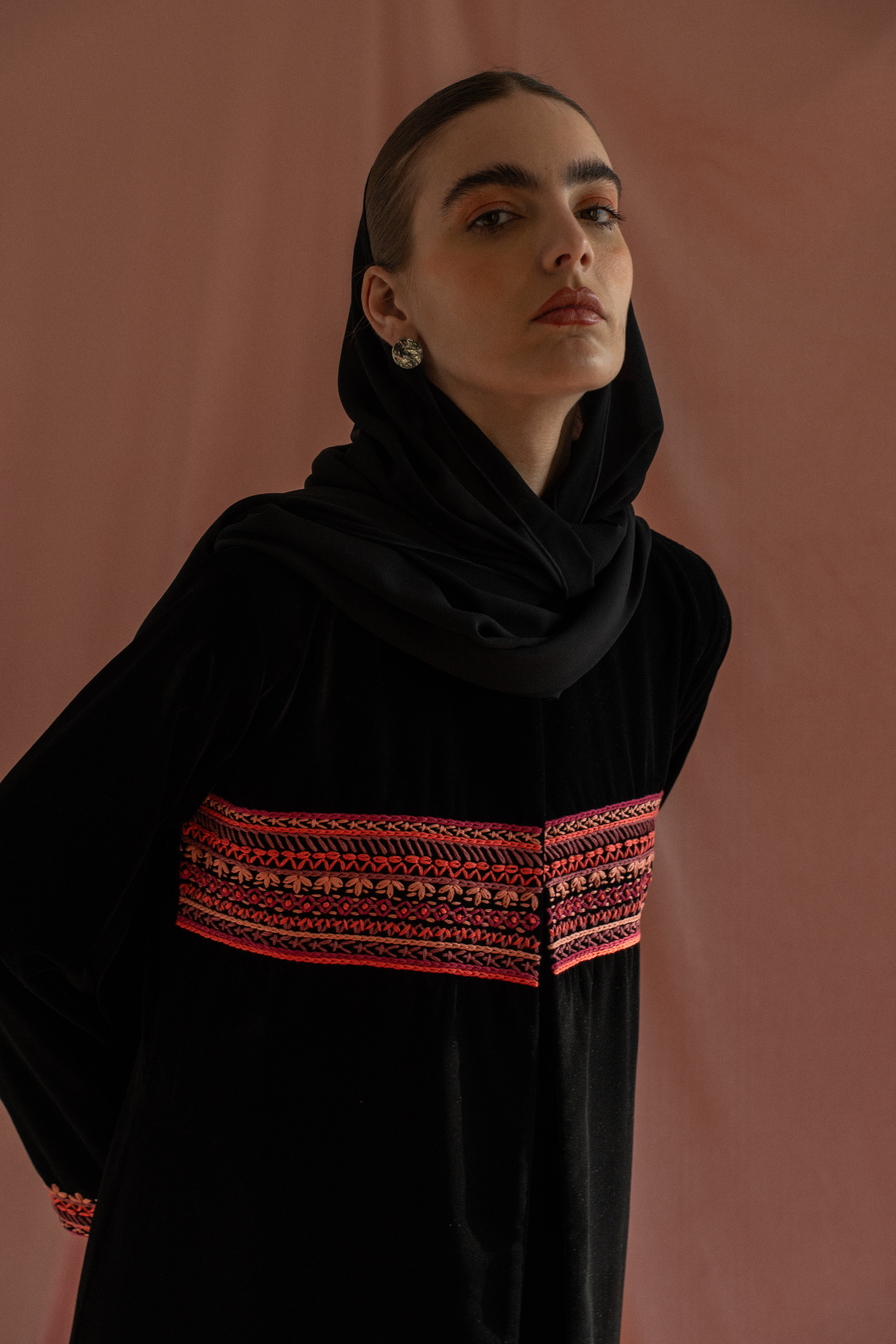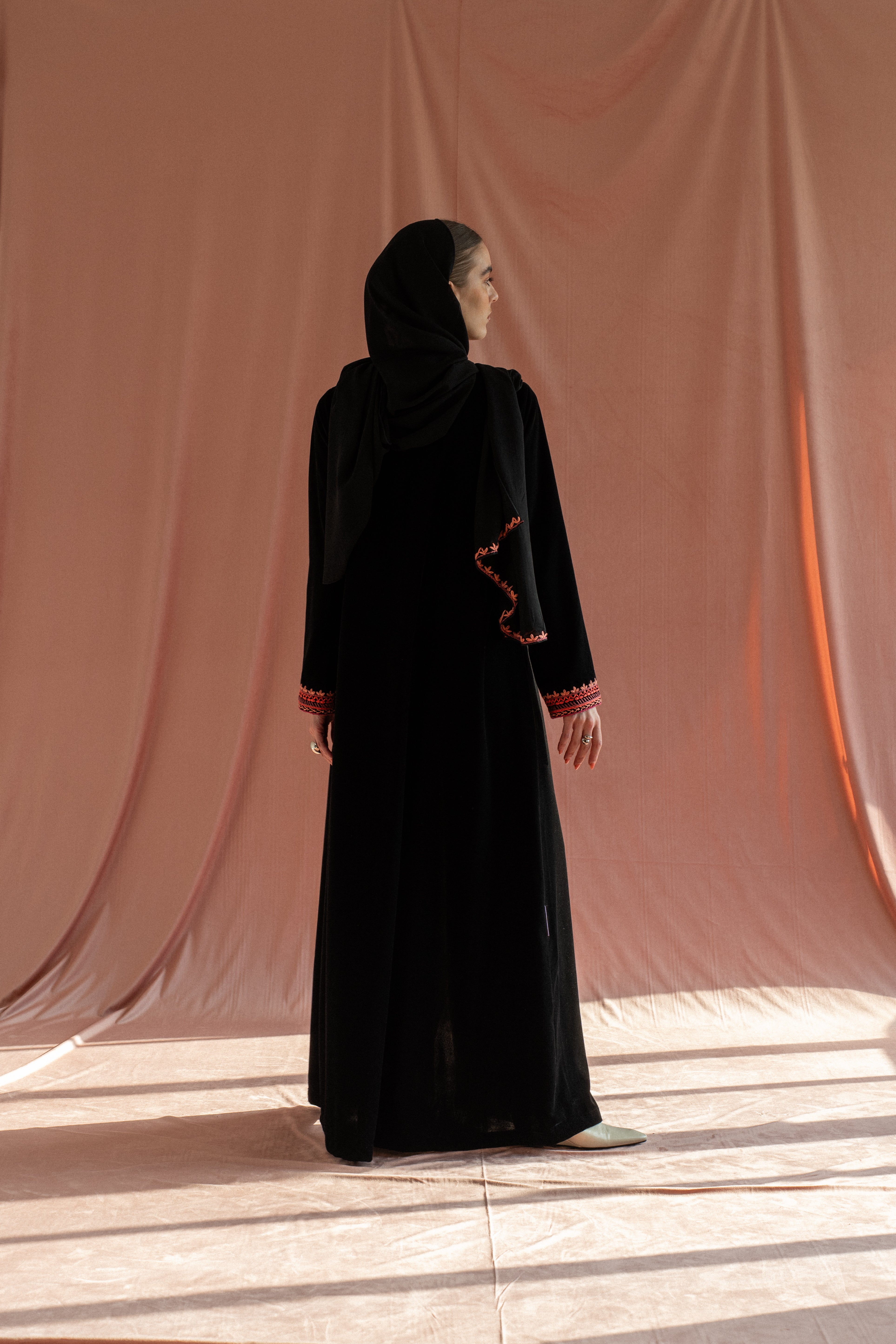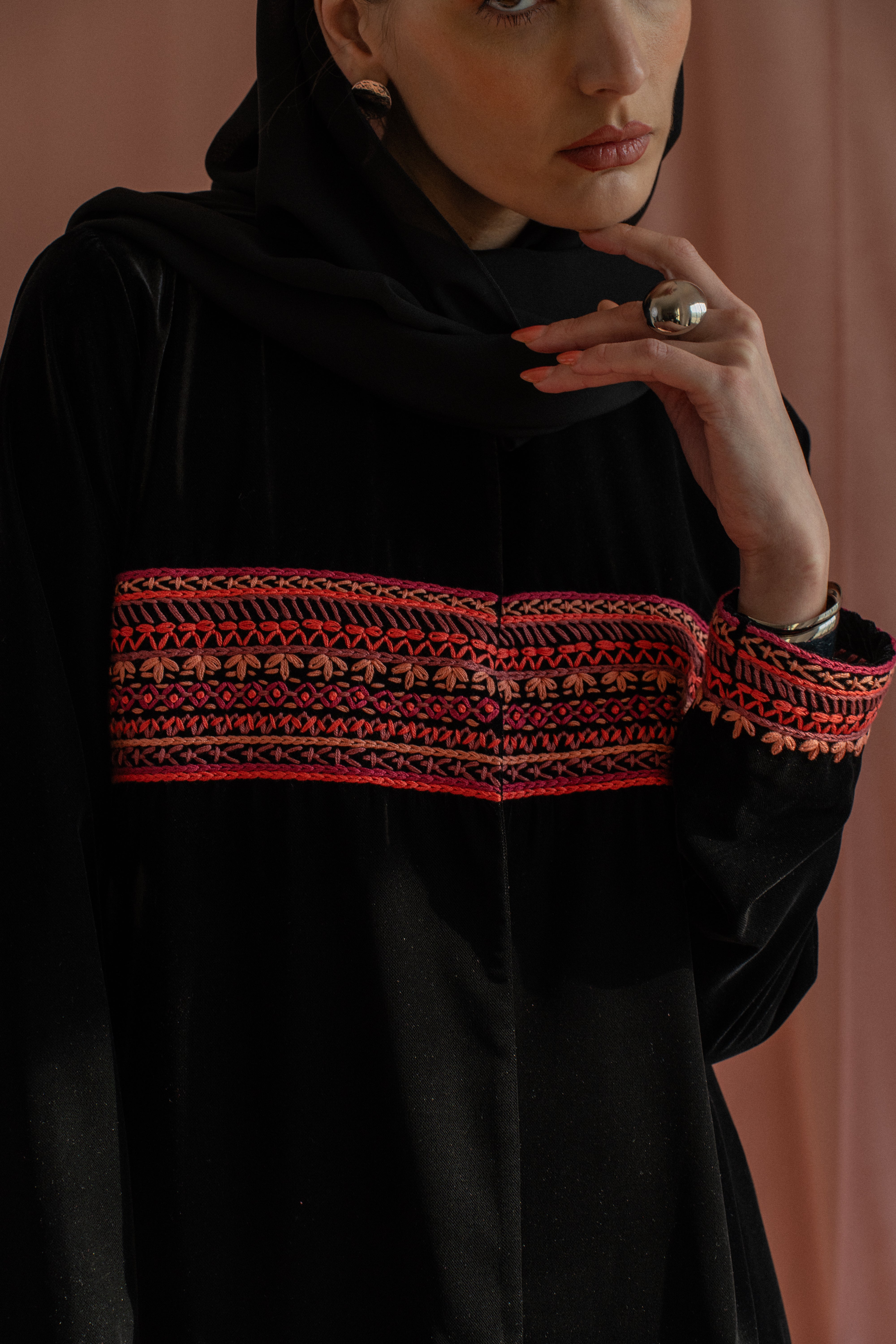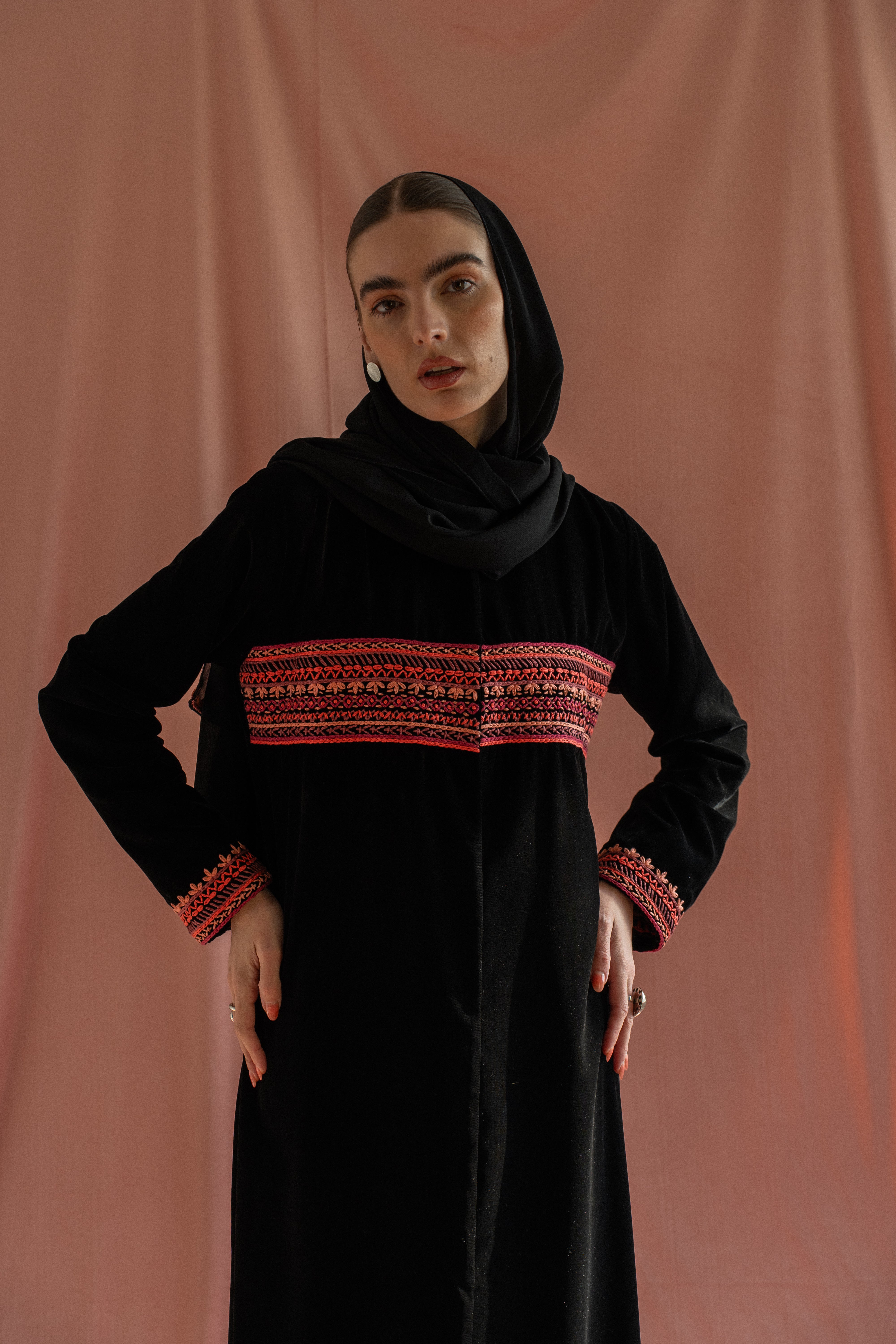 A black velvet abaya detailed with hand embroidery across the chest and around the hands, finished in pink(customizable color). Paired with a matching sheila for a refined, artisanal finish.