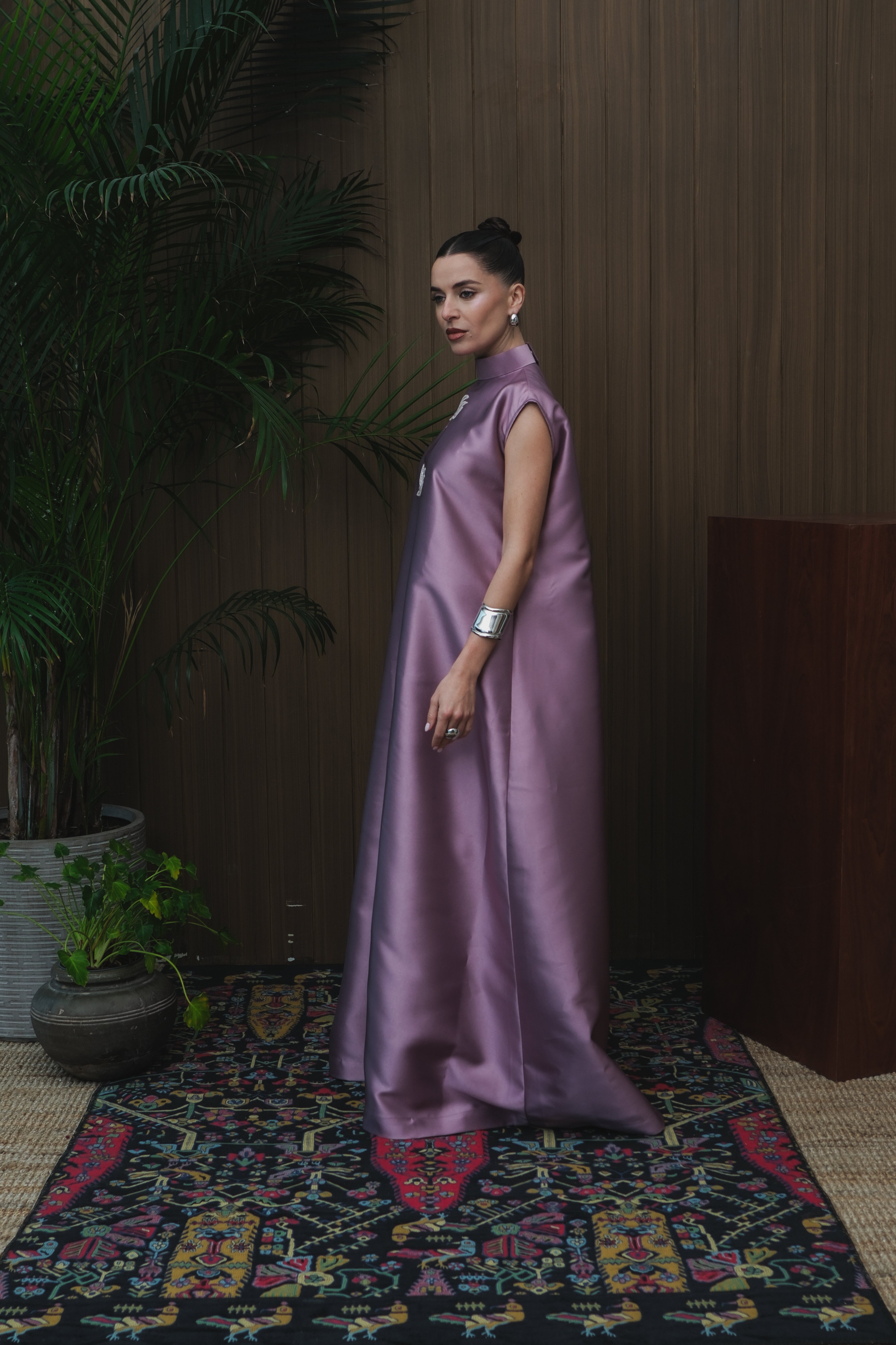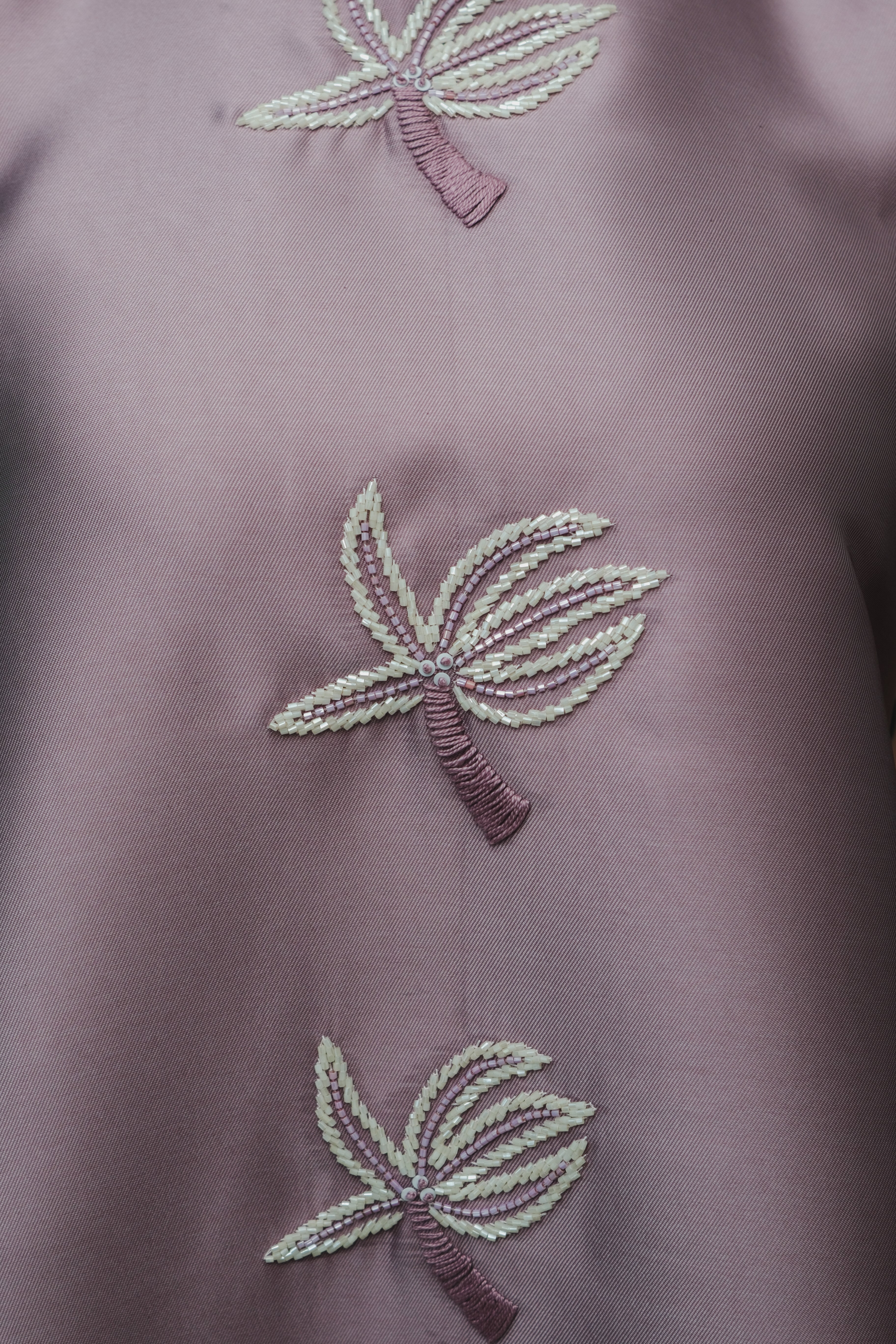 A luminous shade of purple, shimmering with embroidered palms that catch the light like stars on water. The high neck stands with quiet poise, while the sleeveless silhouette flows with effortless grace—a vision of elegance in motion.
