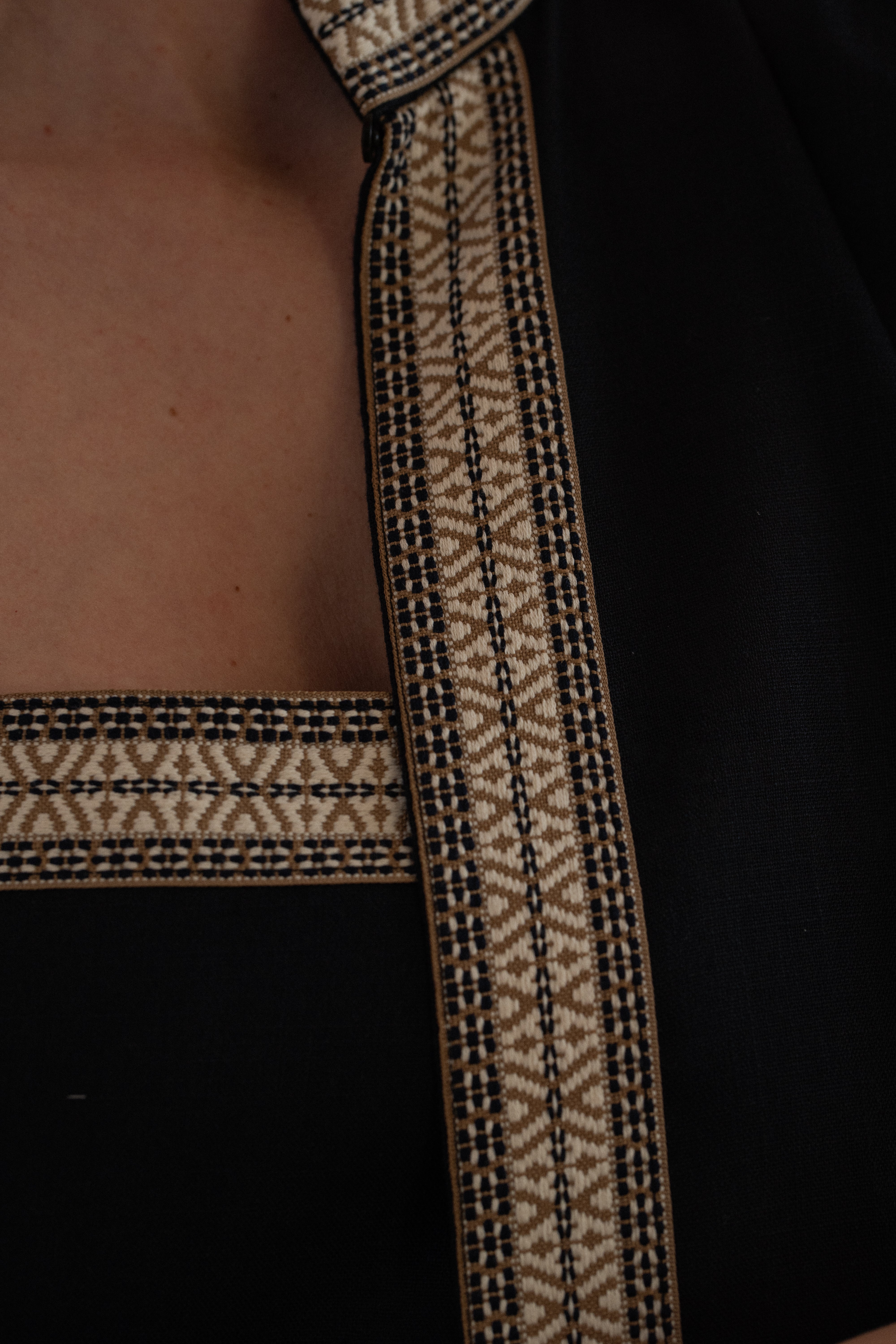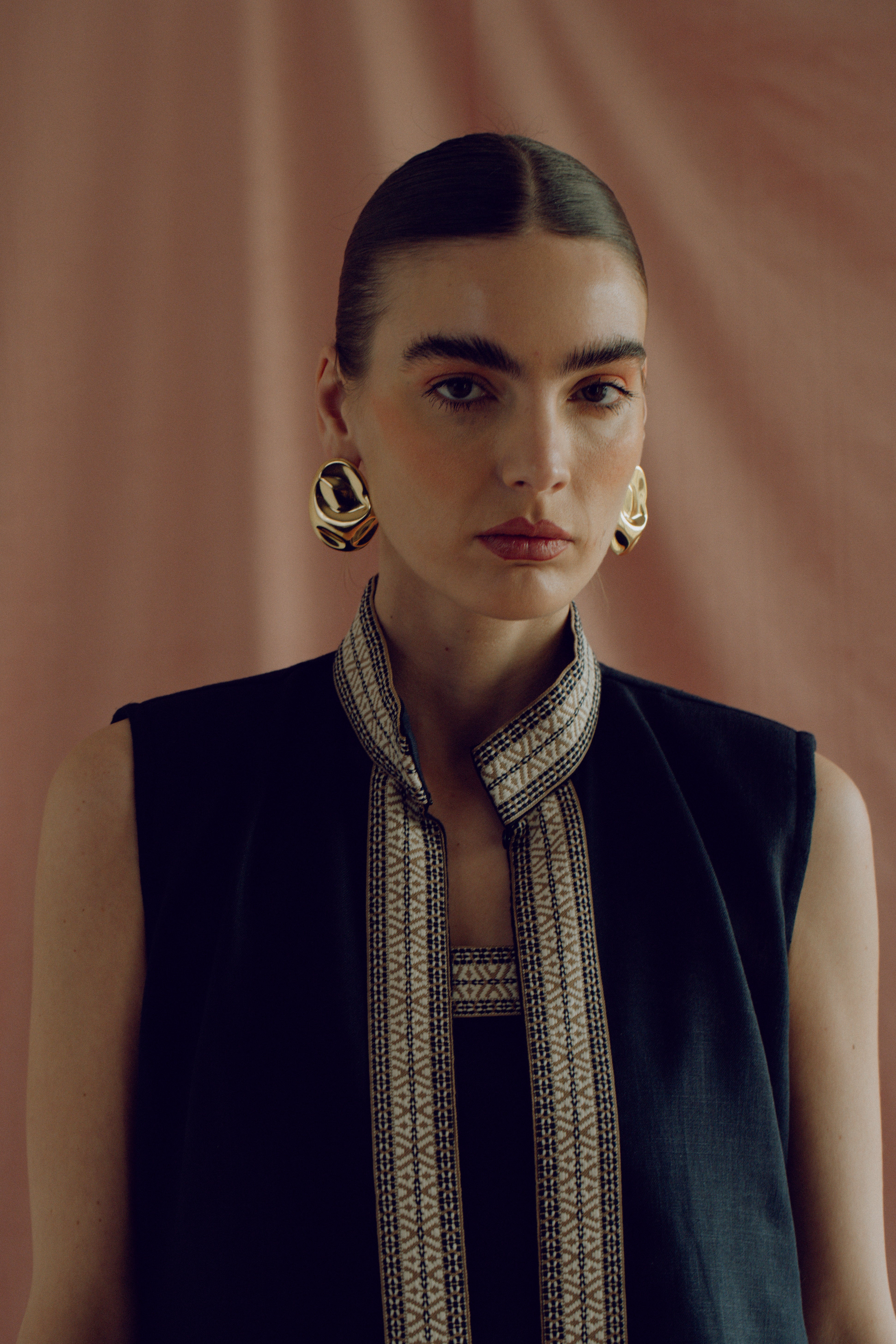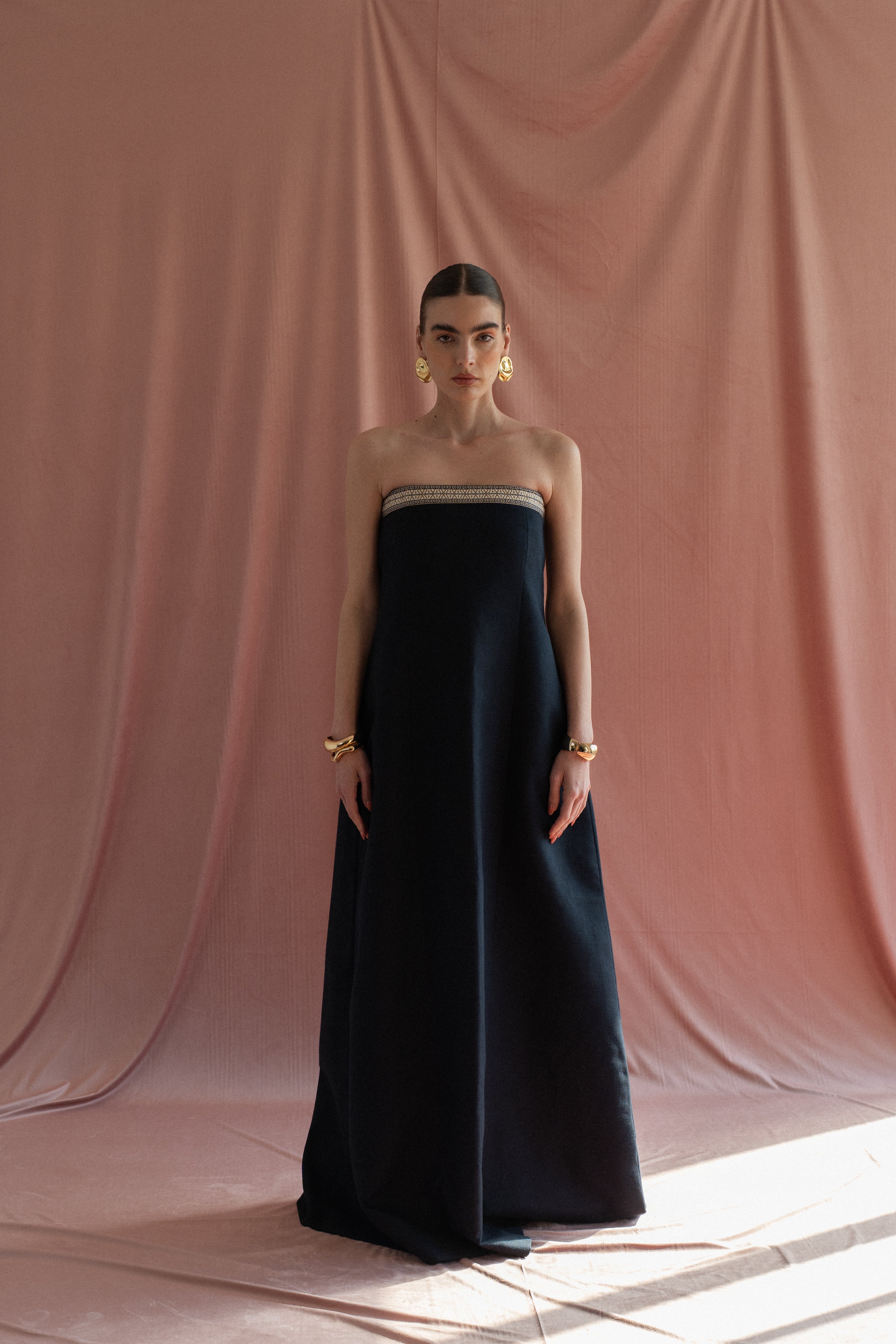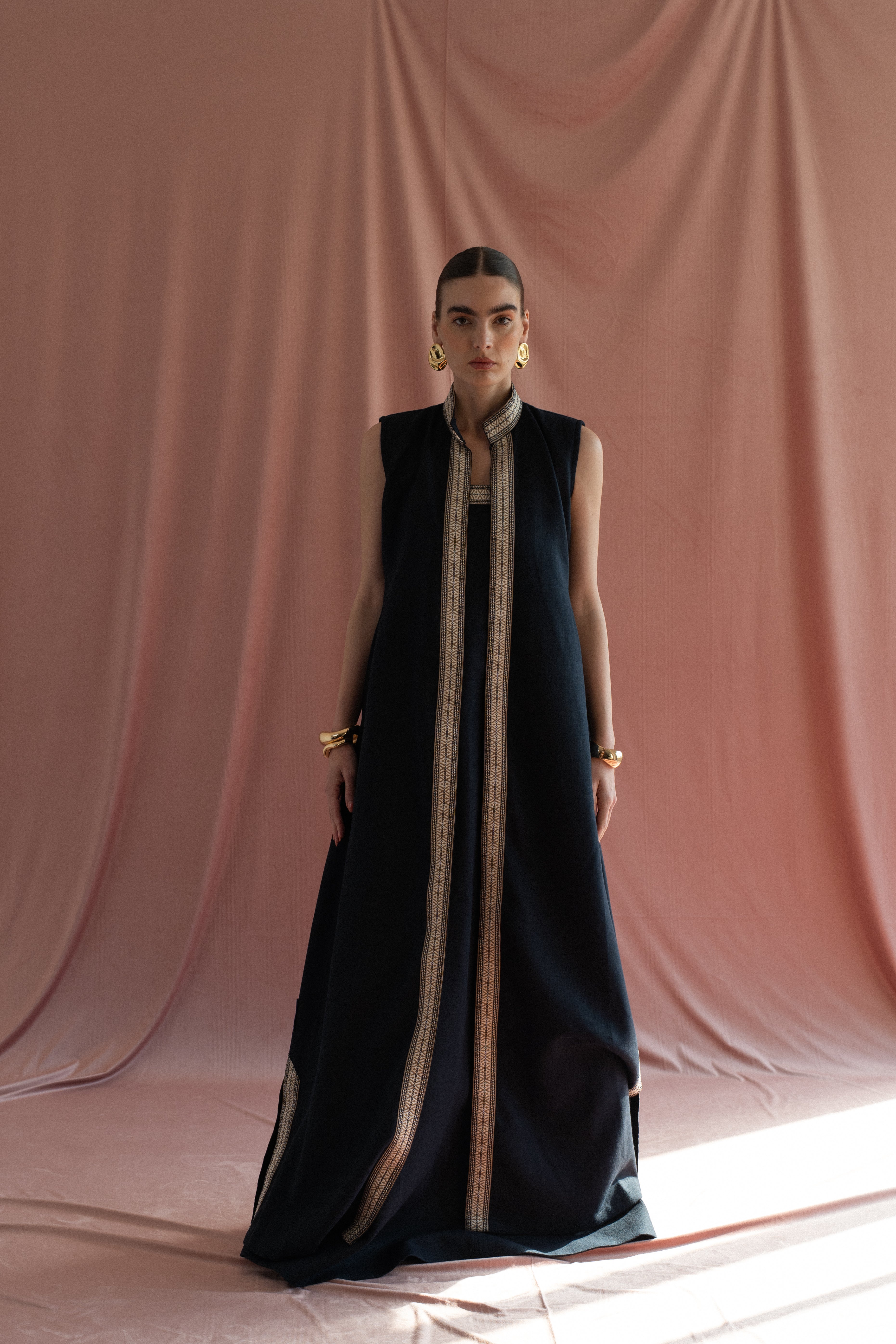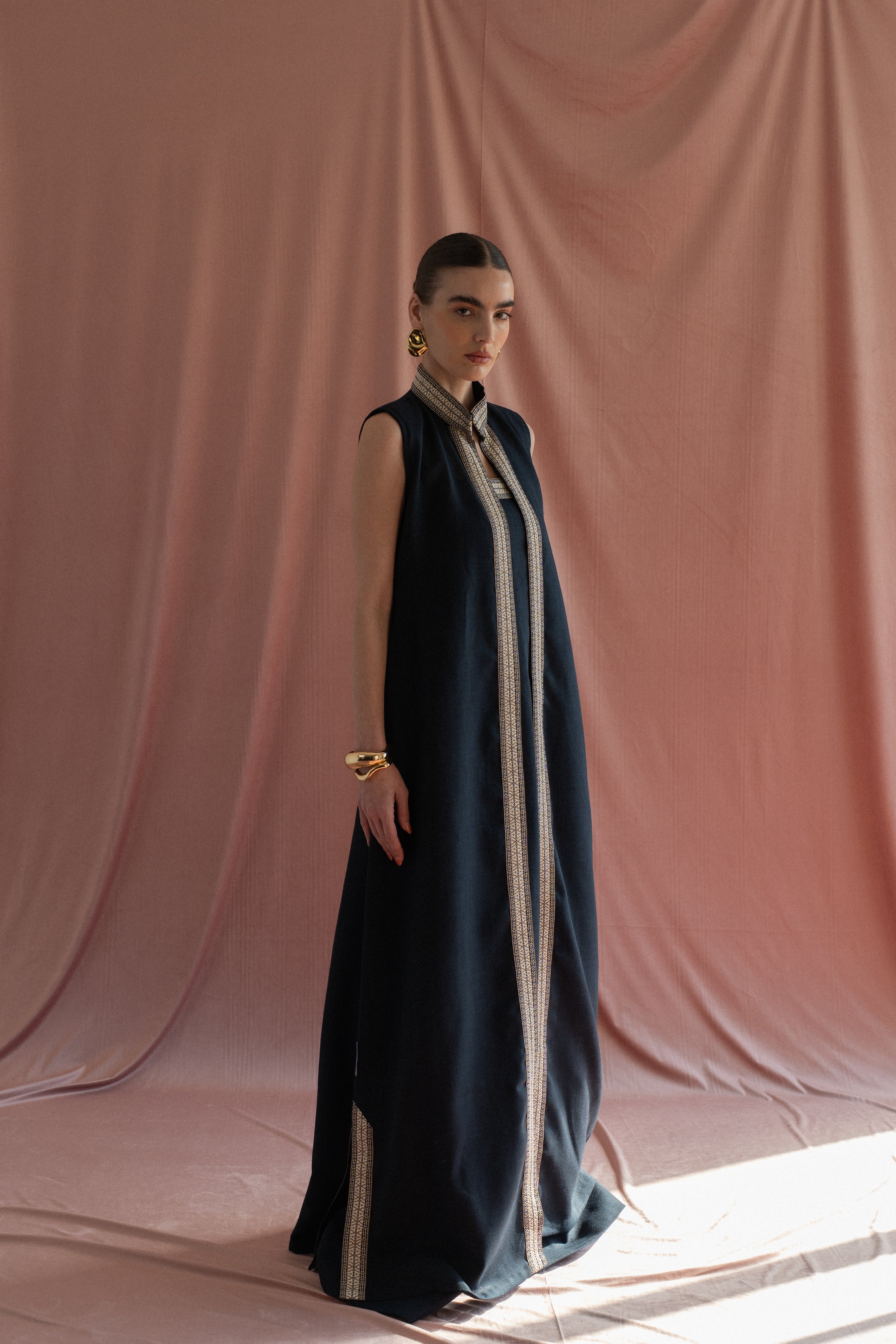 A refined two-piece set crafted from 100% navy linen, featuring a dress and matching sleeveless coat with an oriental-woven lining. Lightweight, structured, and designed for effortless elegance.