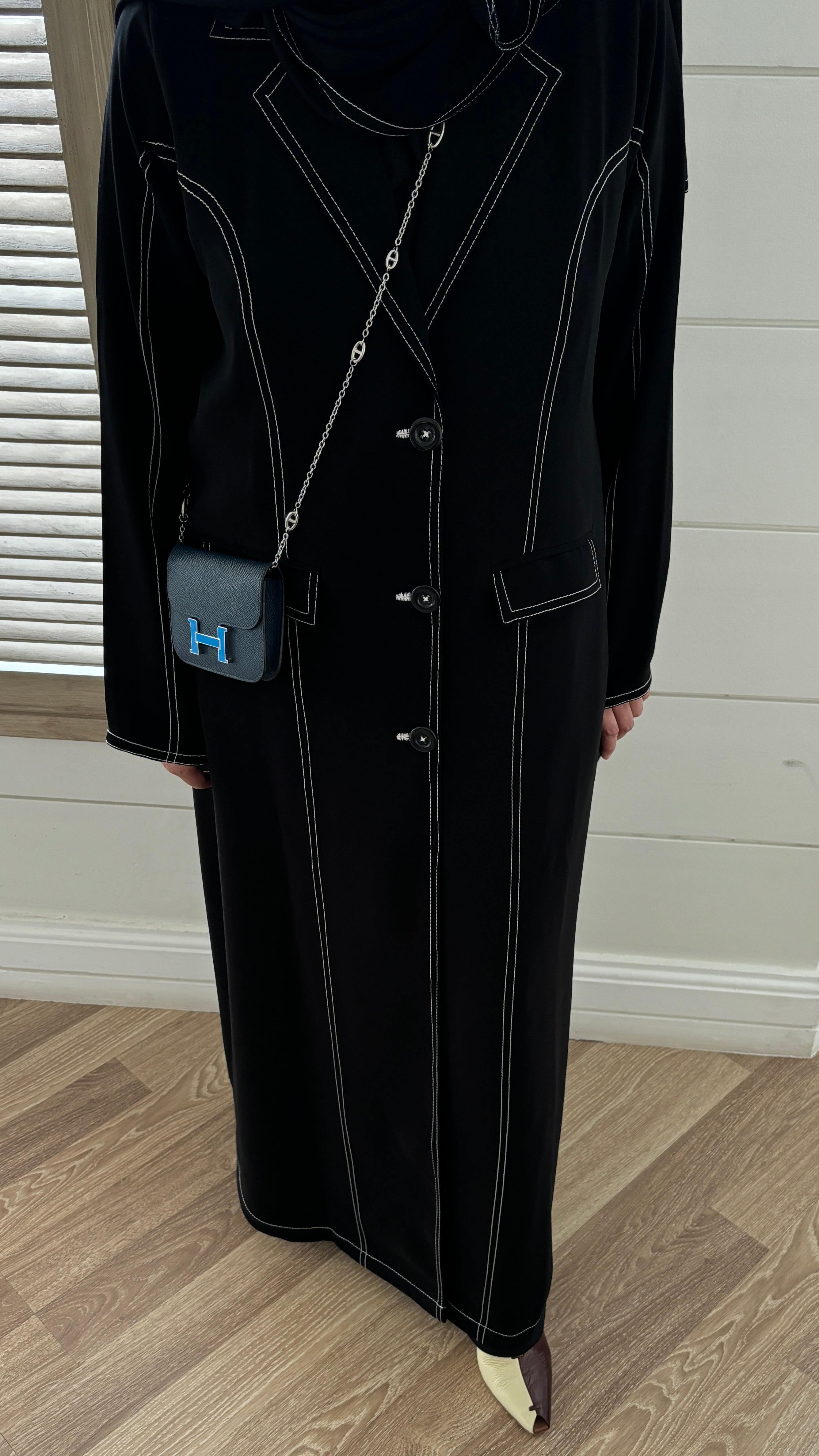 This piece was inspired by the style and cut of a jacket blazer. Adding a twist to the classic black abaya with a red lining to enhance the look and imitation of a blazer. Perfect for a working day and a casual day out.