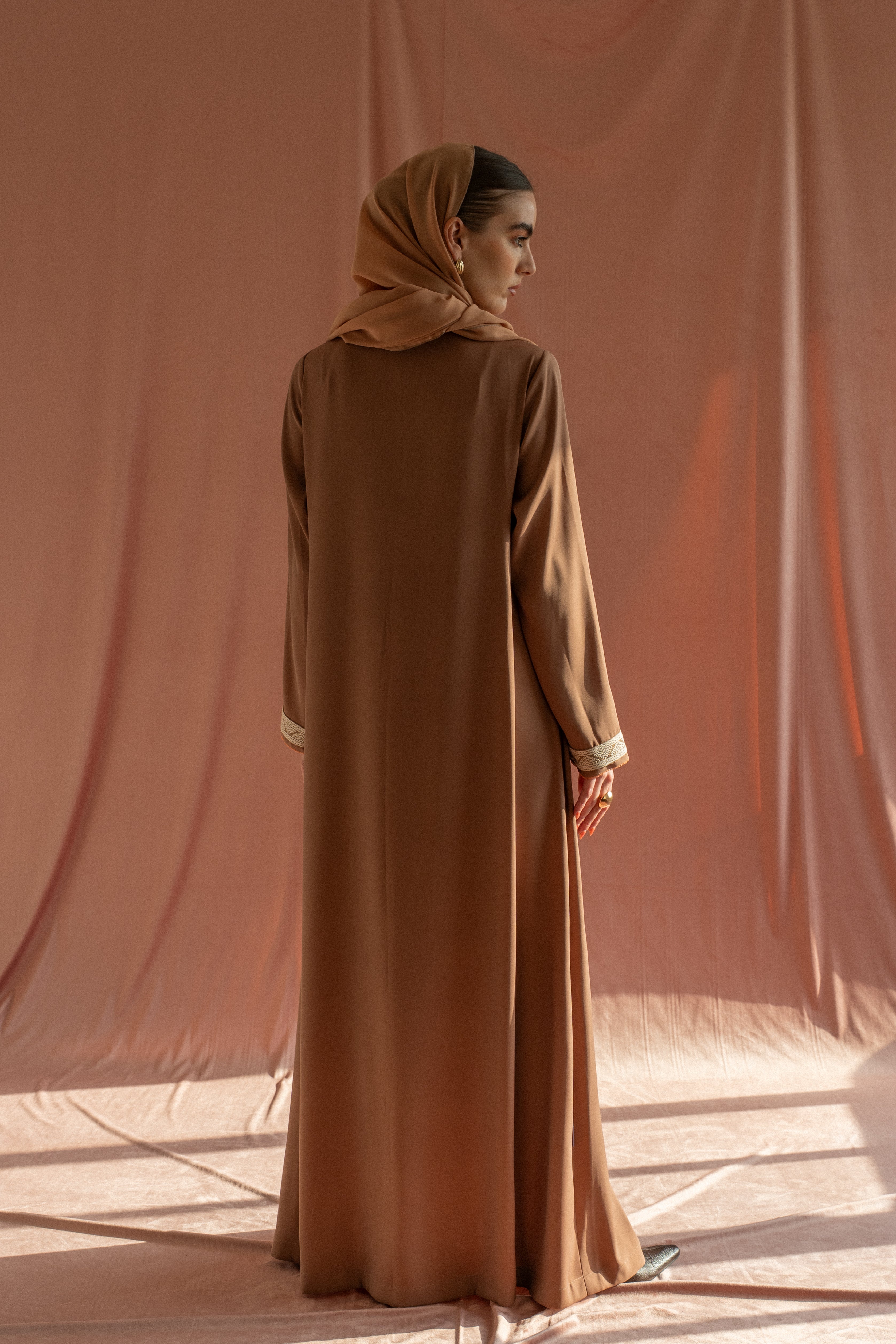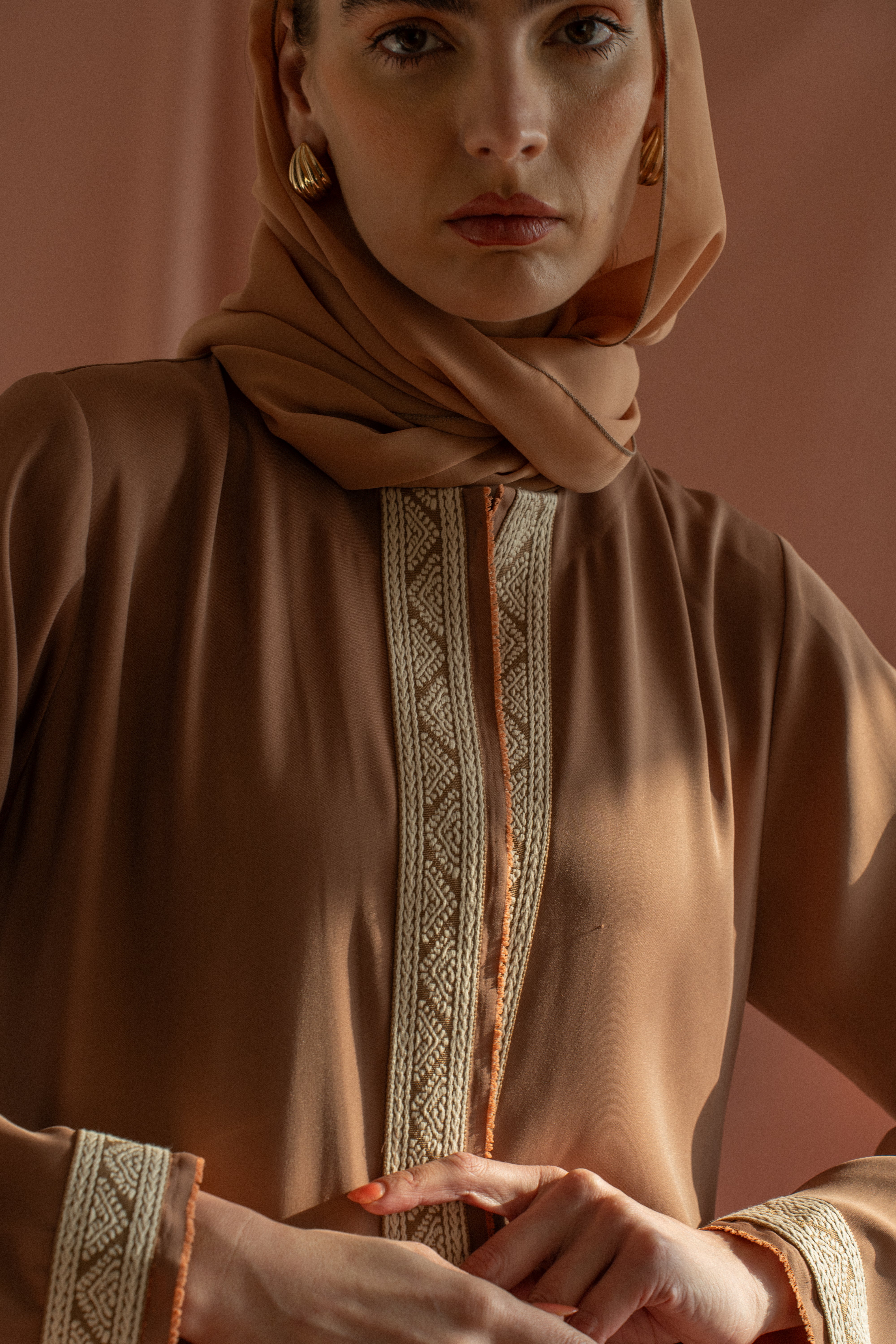 A light brown abaya accented with an abstract triangular detail along the front and hand openings. Paired with a matching sheila, the piece offers a modern, sculptural finish.