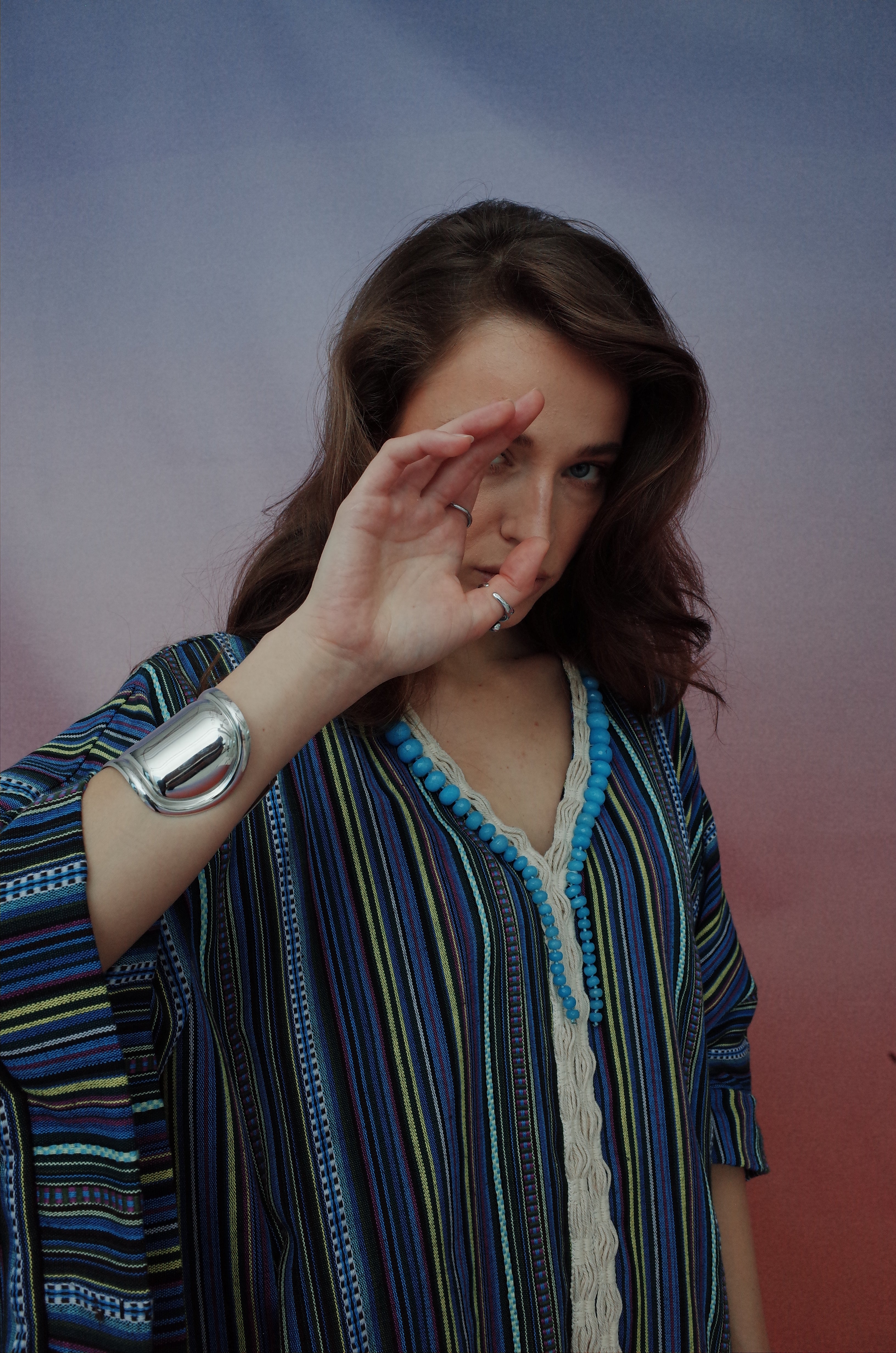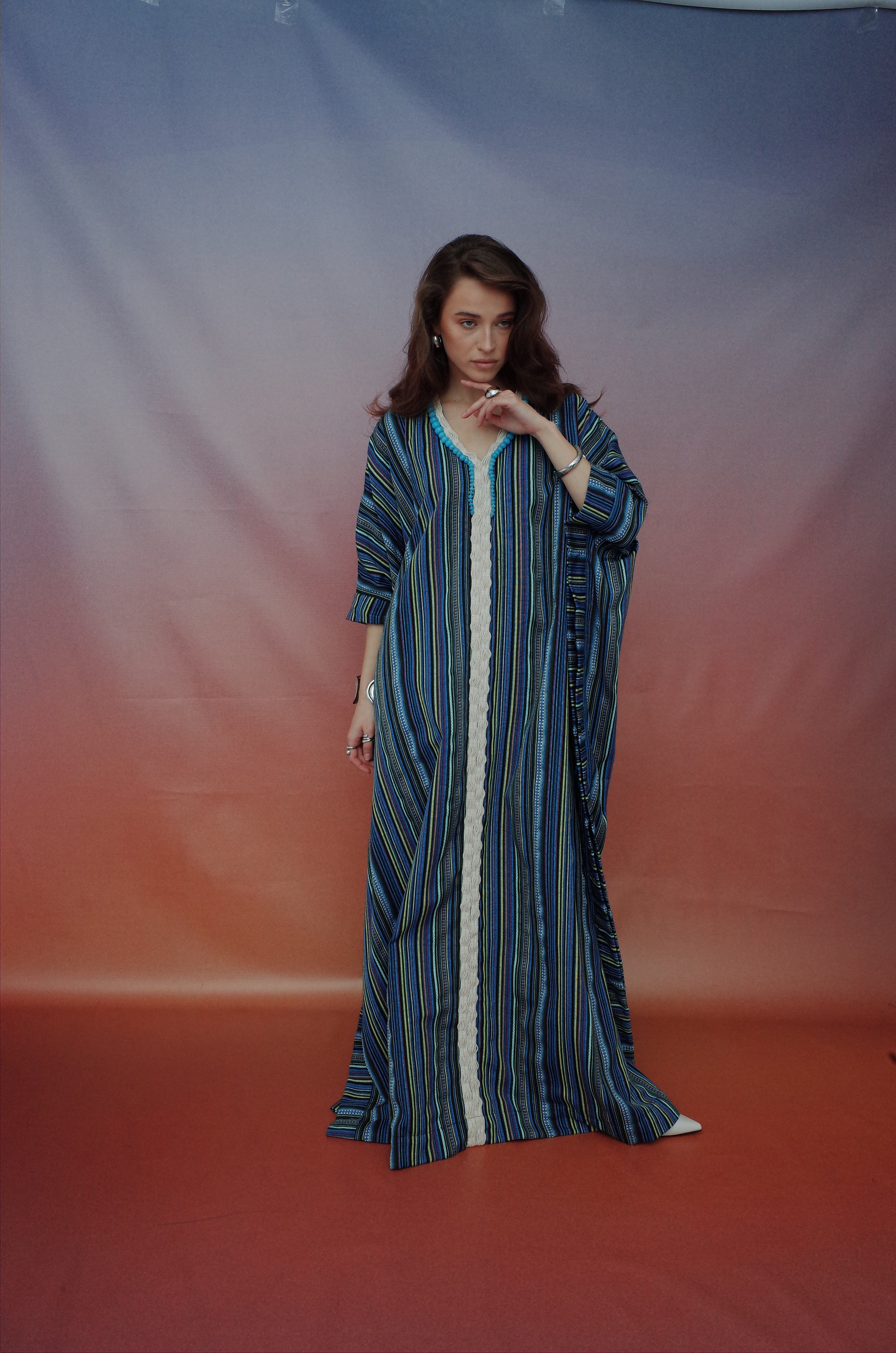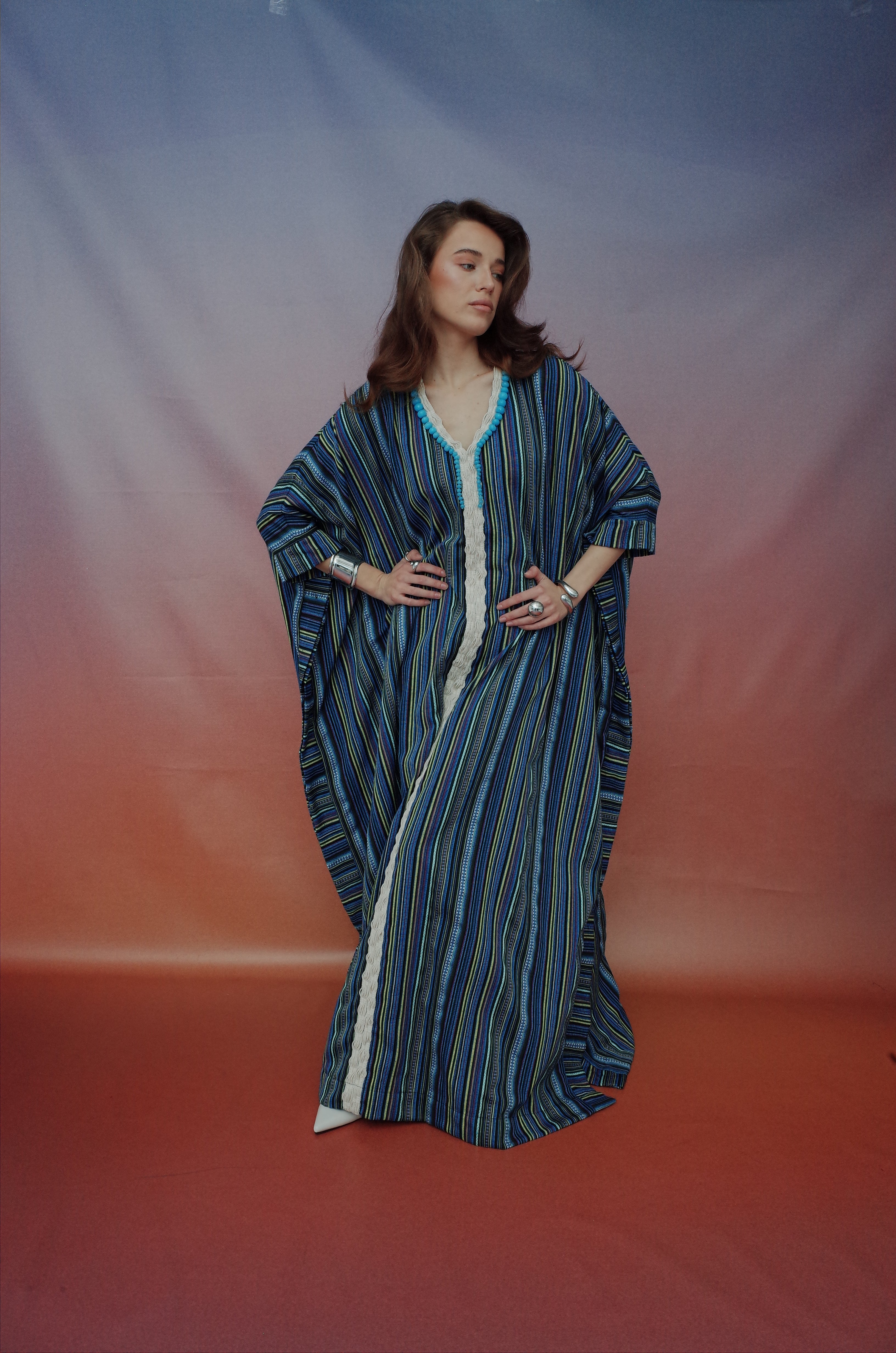 A breeze of blue striped linen, unfolding in a weightless butterfly cut. Braided beige edges trace its form with quiet elegance, while delicate blue beads shimmer at the neckline—like droplets of sky meeting the sea.