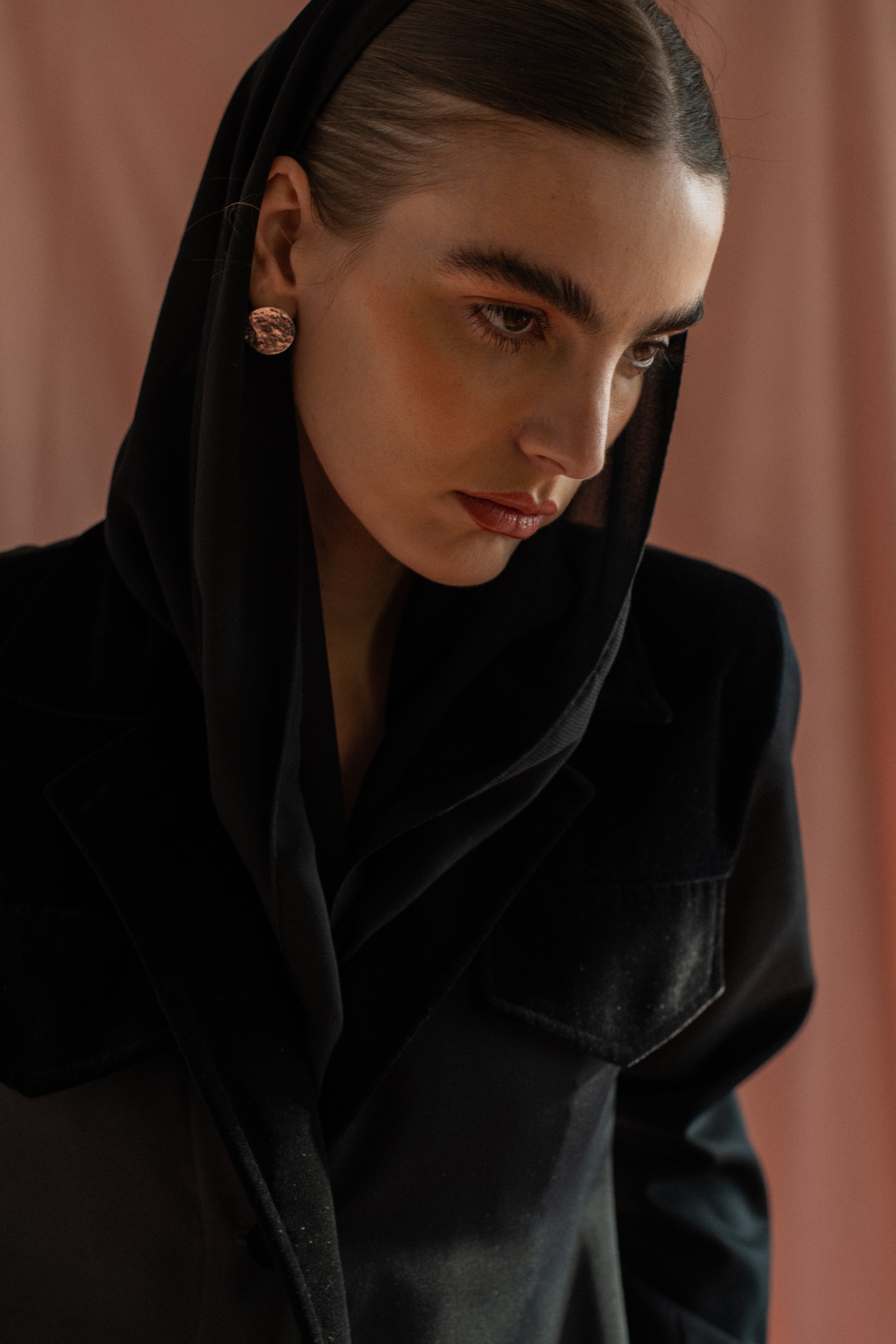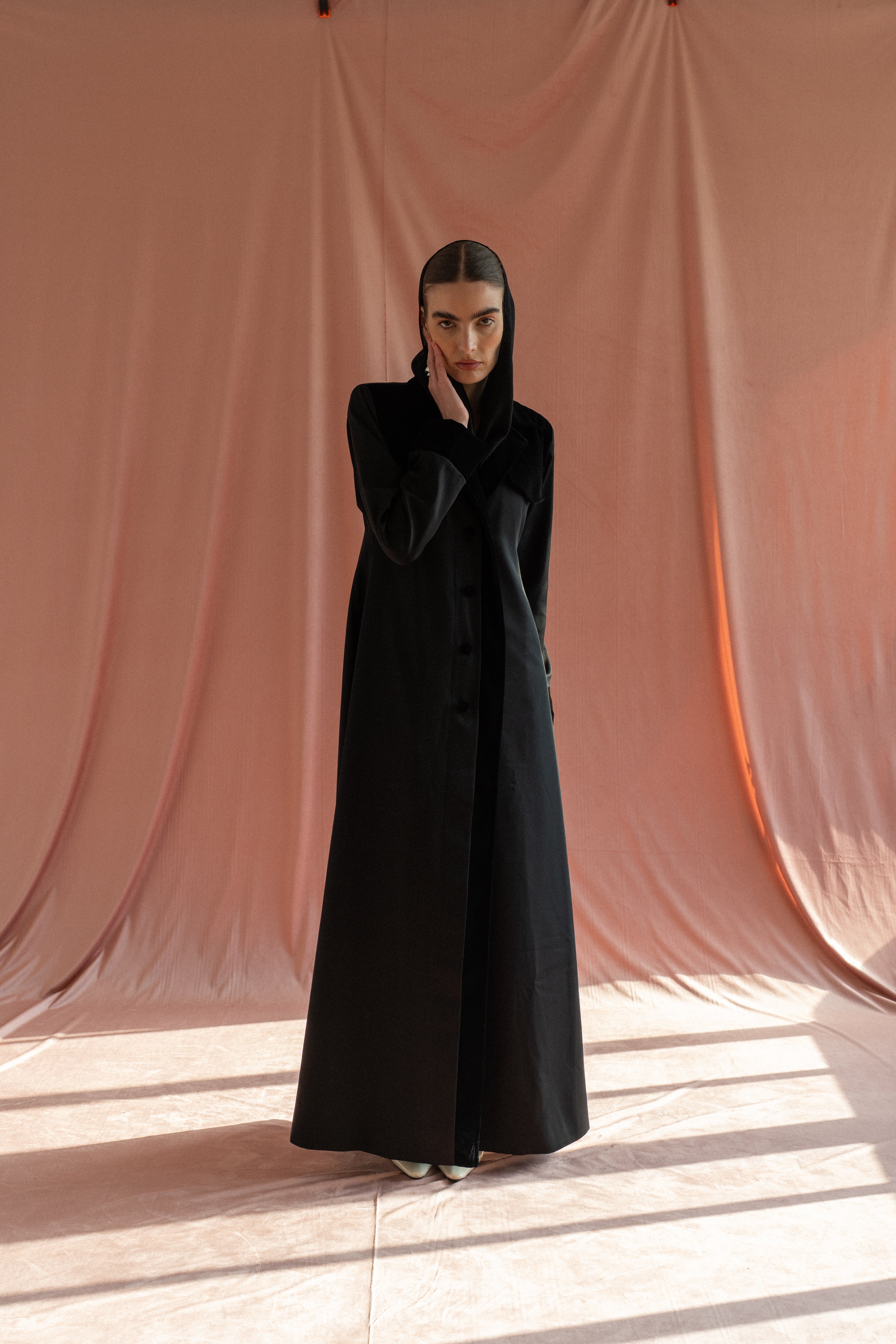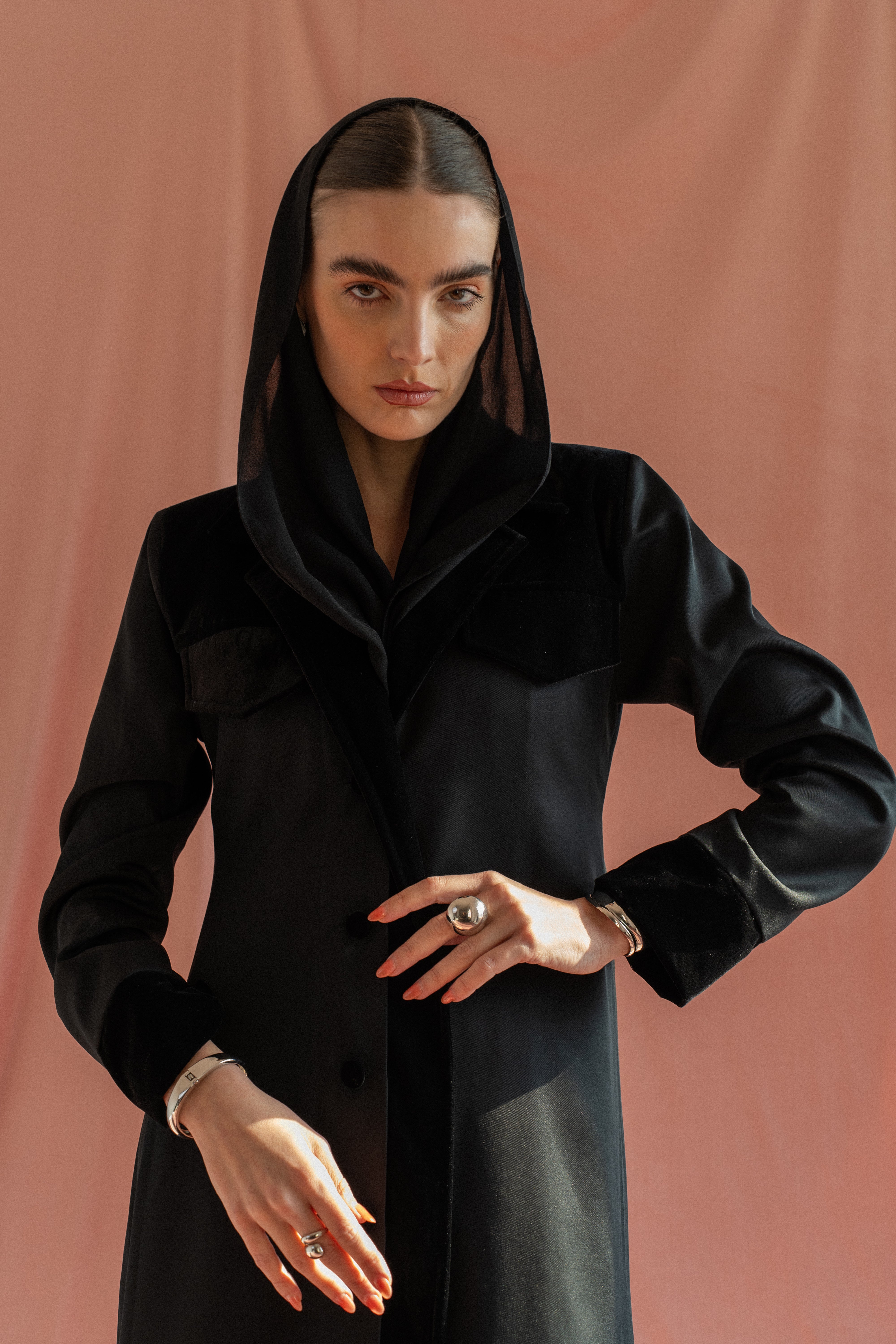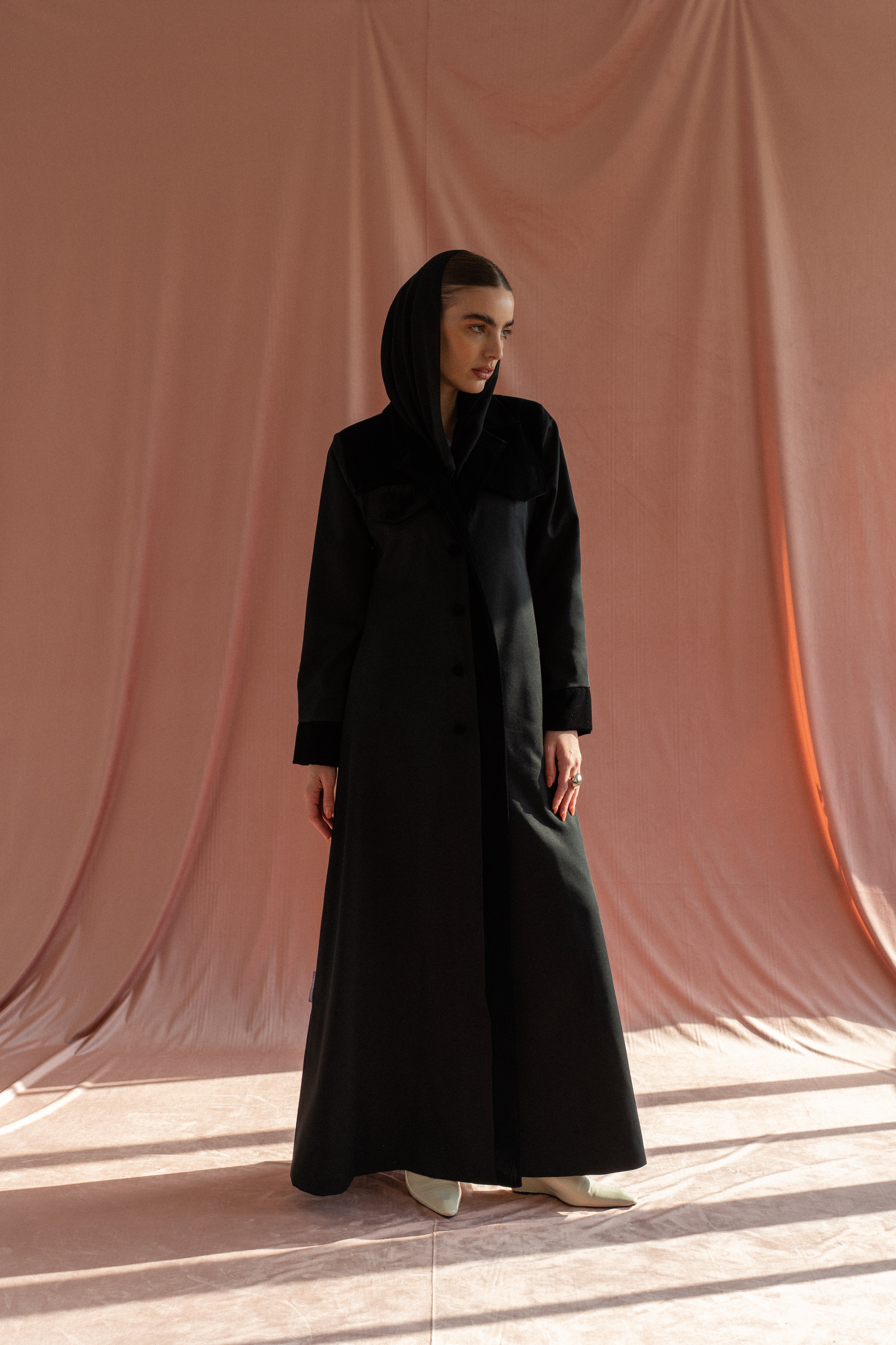 A formal black coat abaya crafted from velvet and cotton, designed with padded shoulders for a structured silhouette. Finished with a matching sheila for a sharp, refined look.