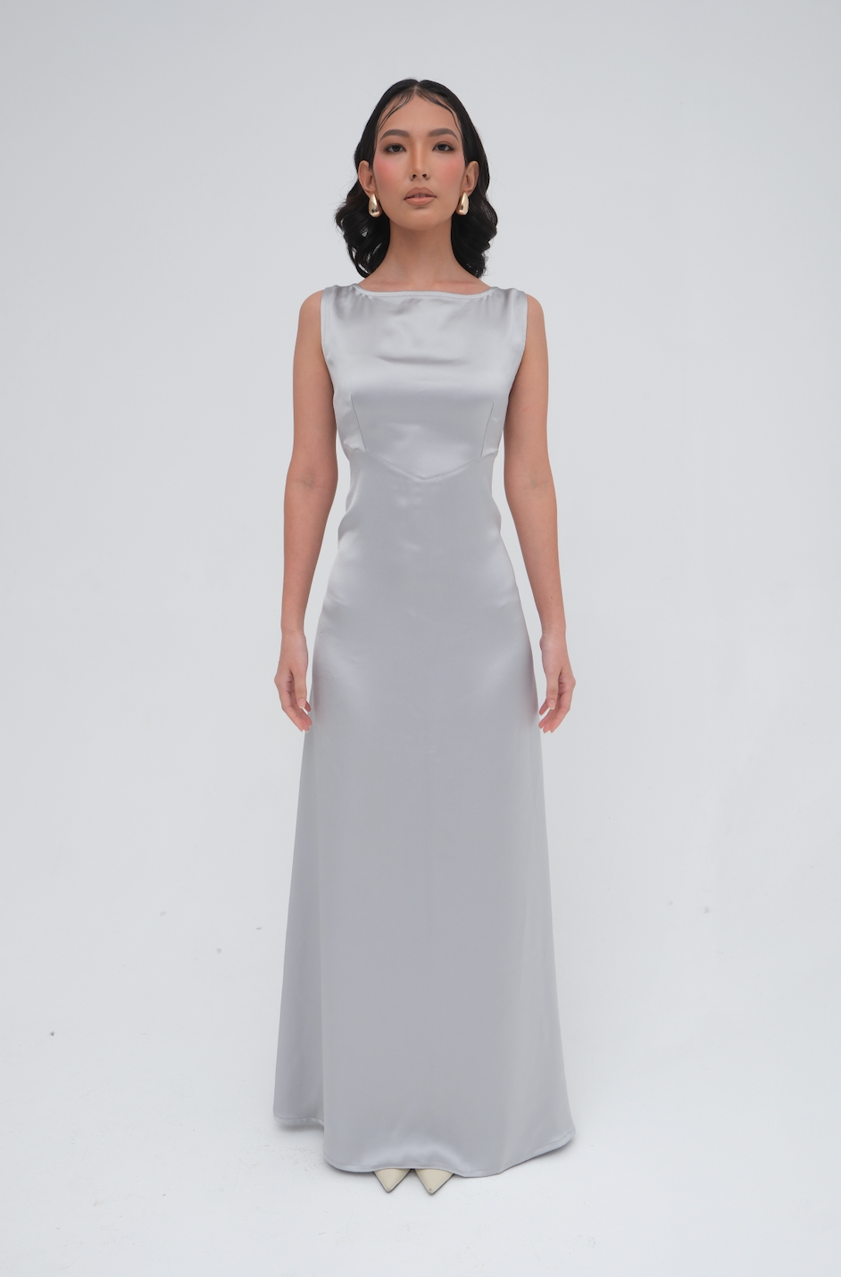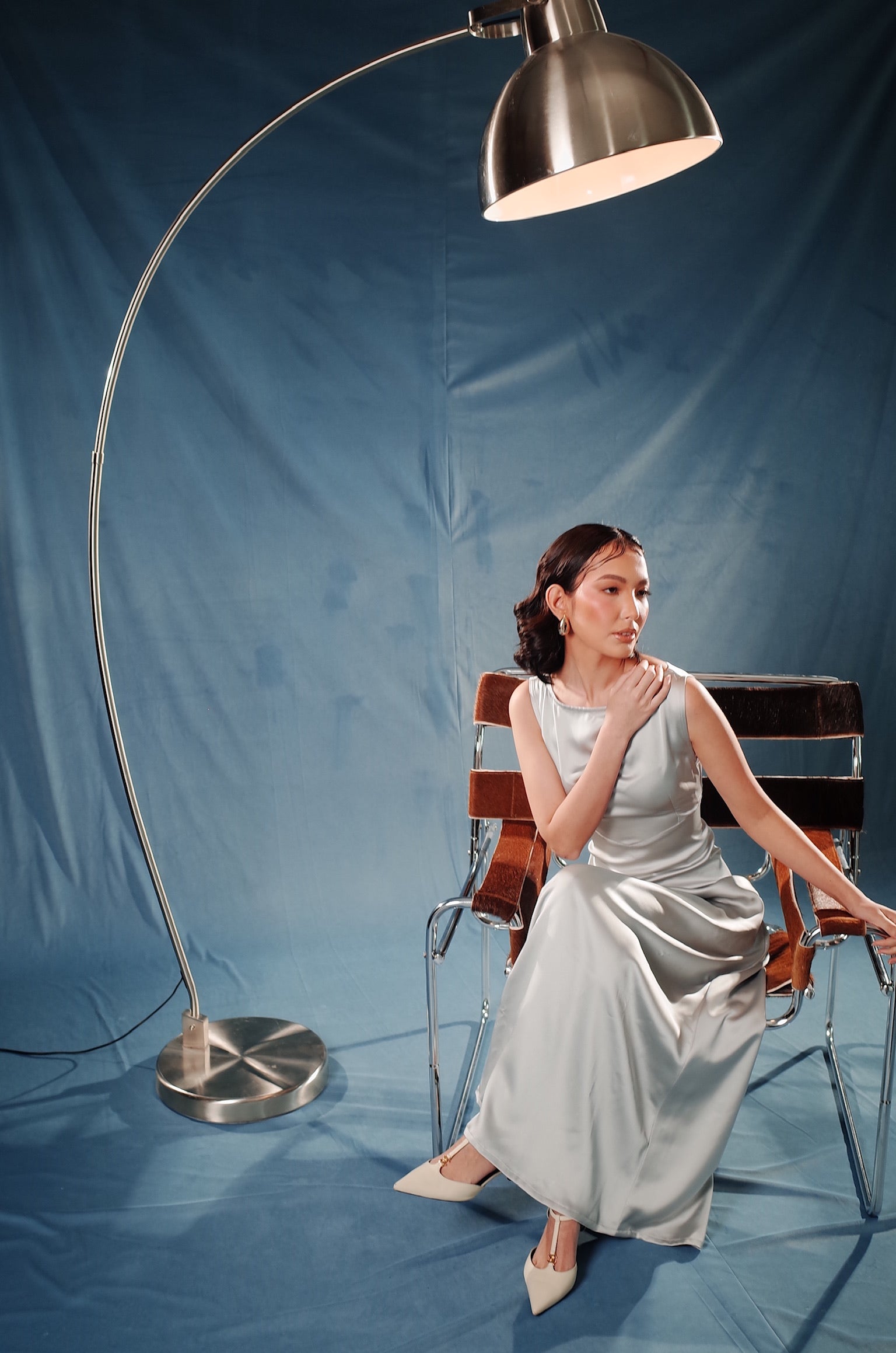 Solene moves like sunlight on still water—quiet, fluid, and full of grace. Crafted from pure silk, its soft sheen catches the light with every step, creating a gentle glow that lingers. The sculpted bodice and curved seam lines shape the silhouette with ease, while the high neckline adds a note of quiet strength.