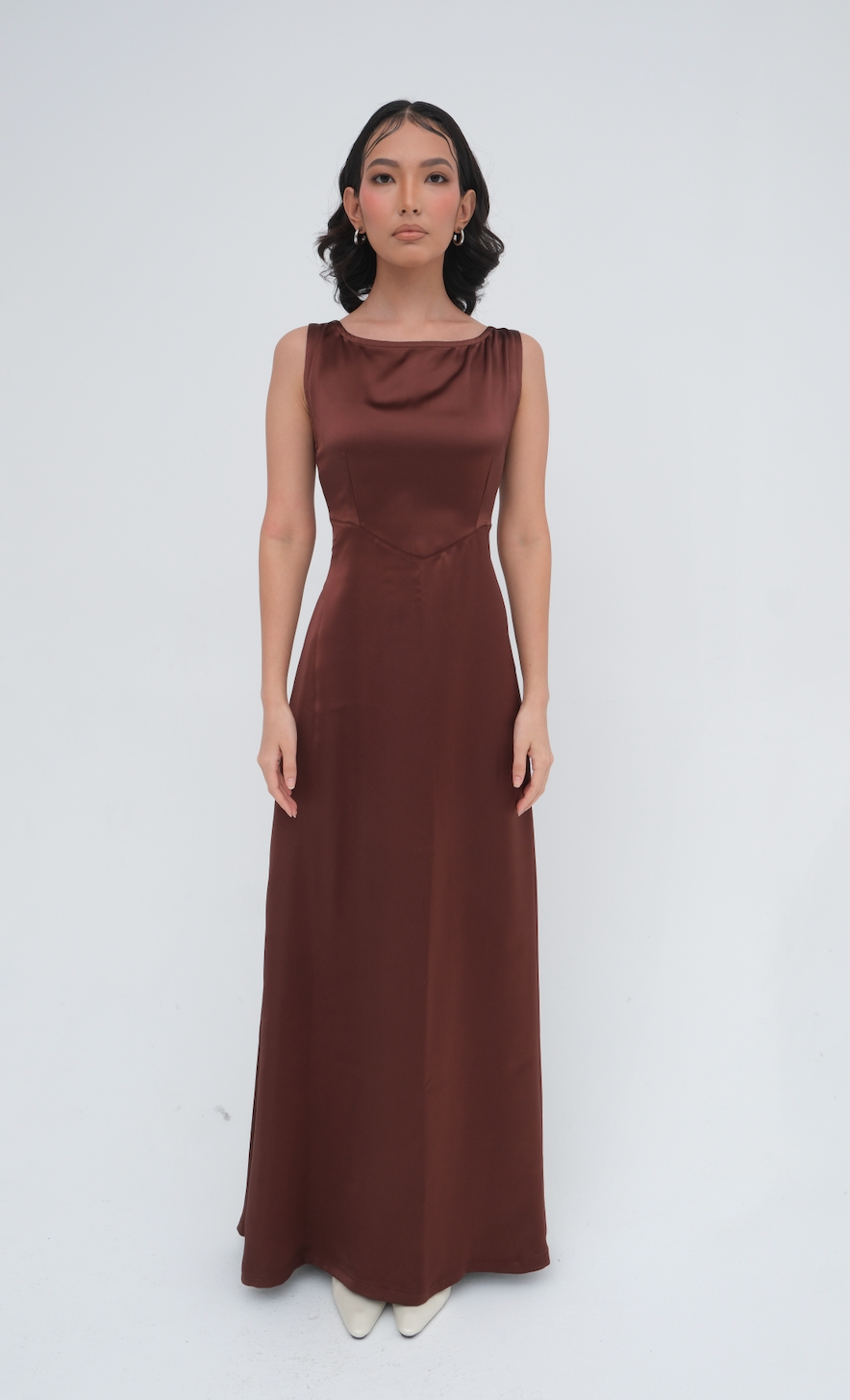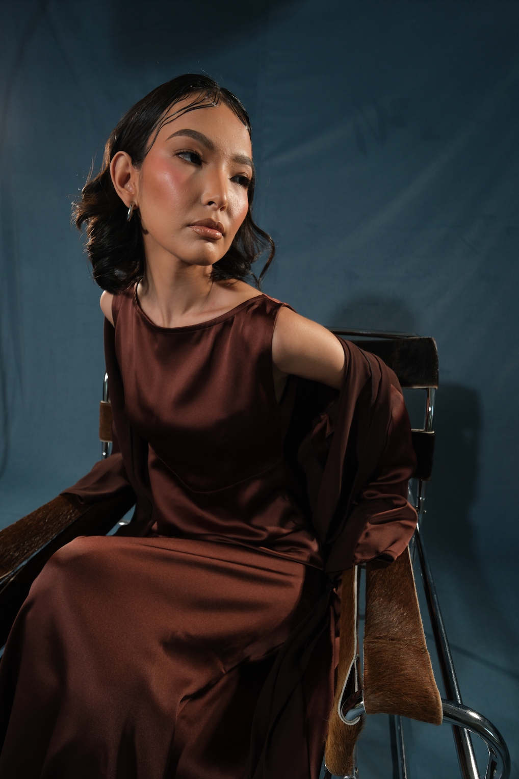 Solene moves like sunlight on still water—quiet, fluid, and full of grace. Crafted from pure silk, its soft sheen catches the light with every step, creating a gentle glow that lingers. The sculpted bodice and curved seam lines shape the silhouette with ease, while the high neckline adds a note of quiet strength.