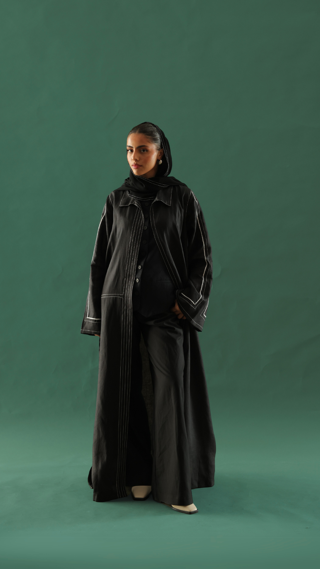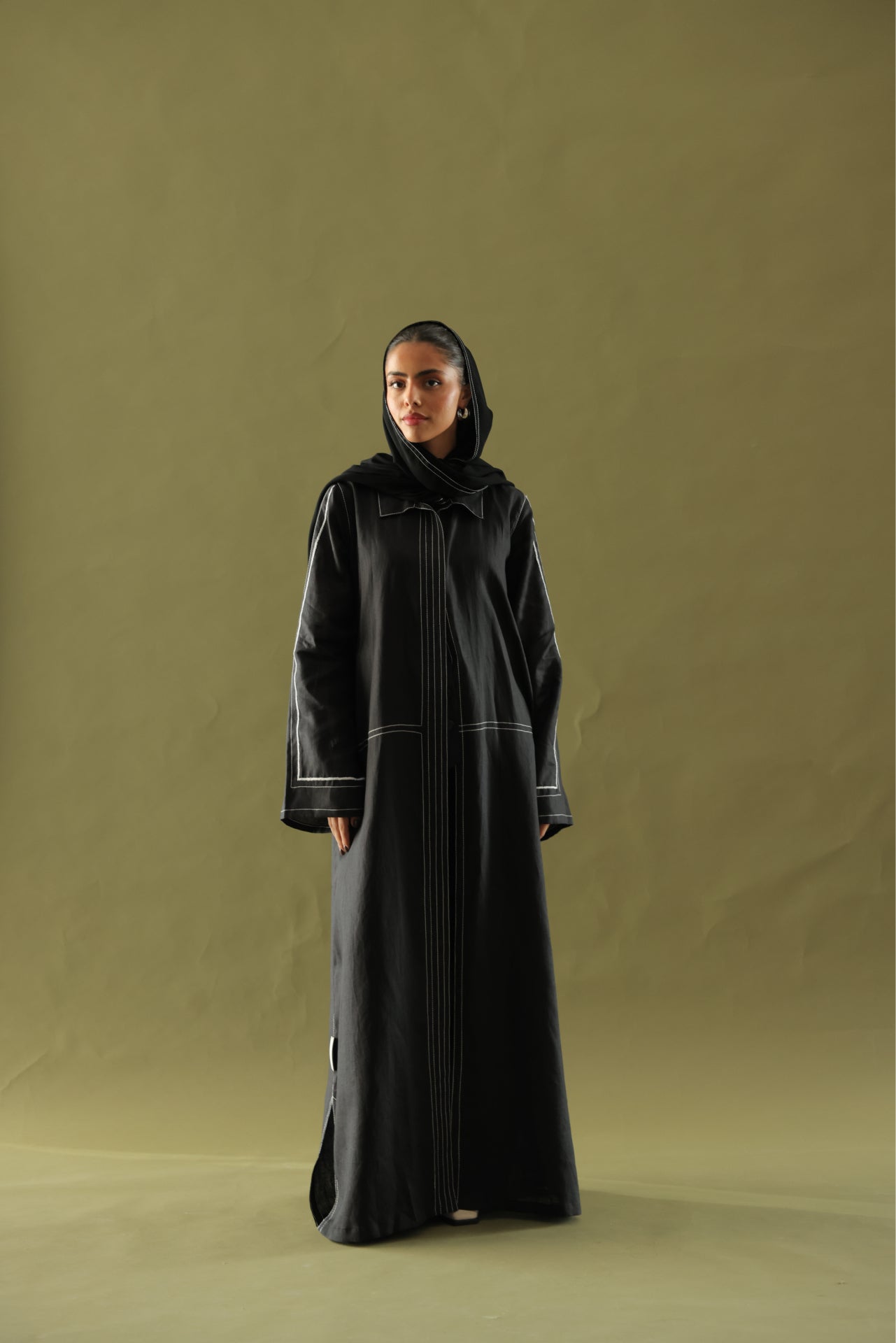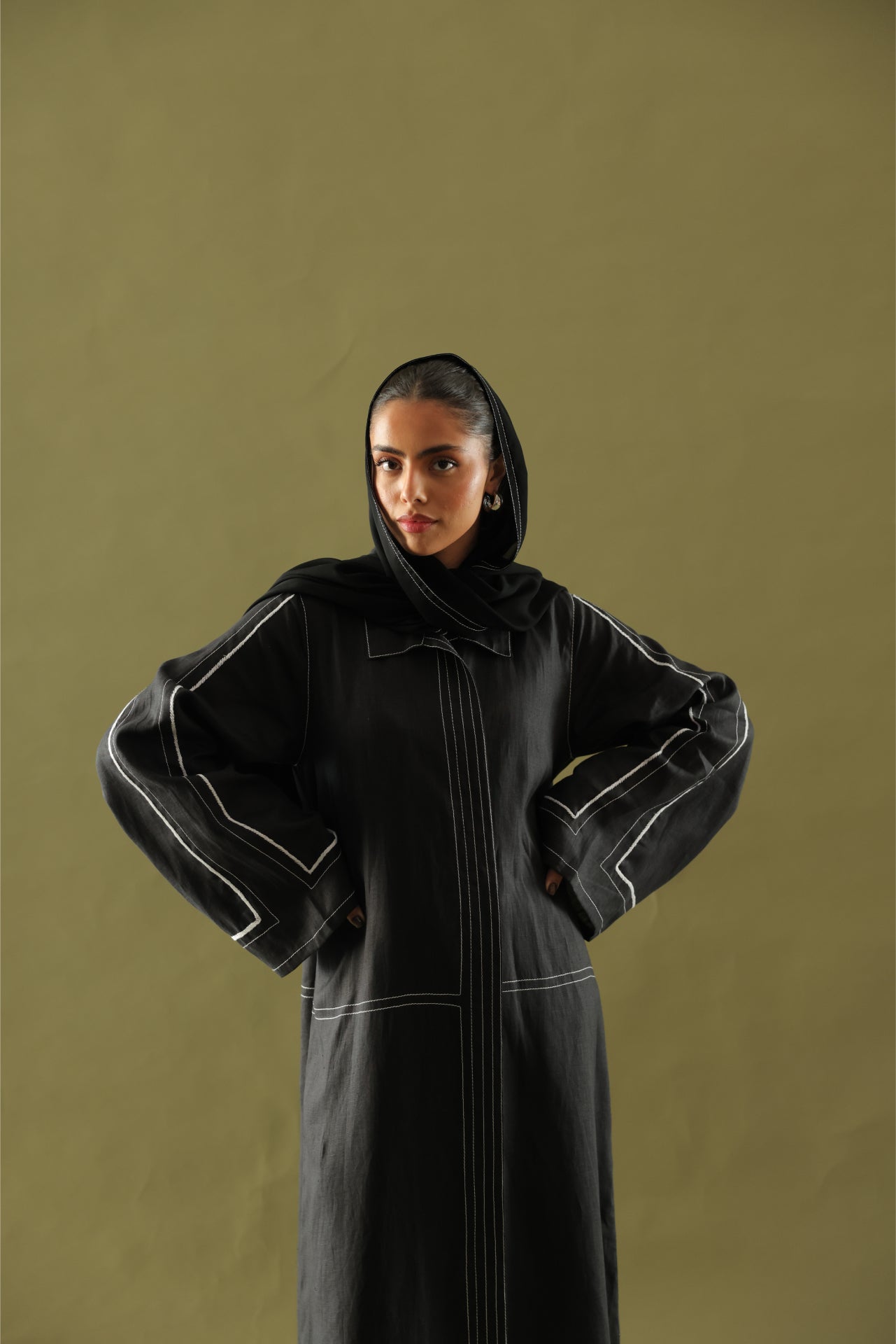 Black sheer linen, with subtle white lines was an inspiration from the classic black abaya with a twist. This piece showcases multiple white lines on beautifully black linen to create a subtle silhouette around the abaya. It’s elegant, bold, and can be worn anytime of the day.